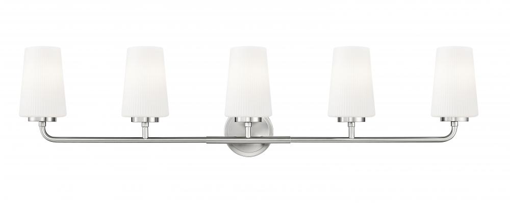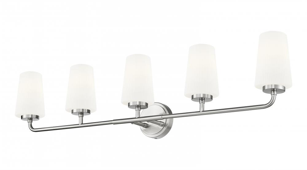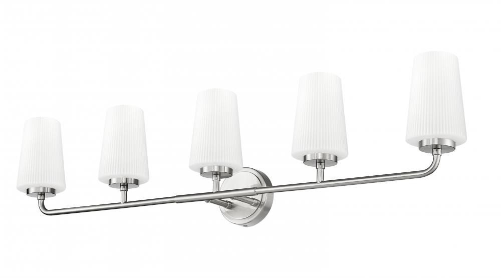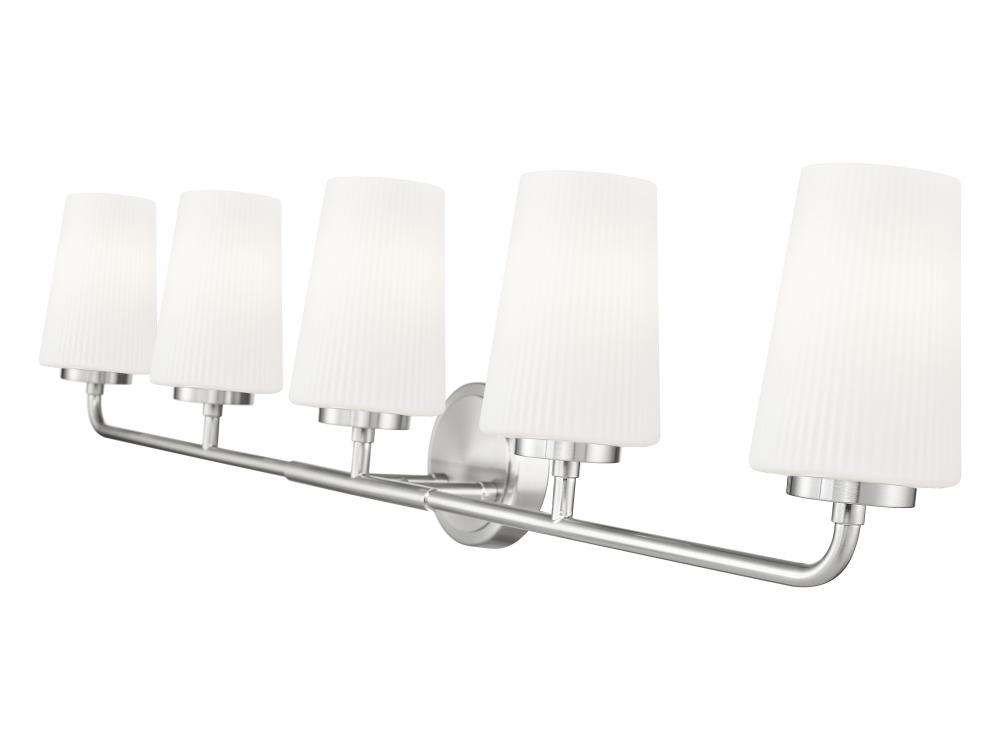 Grand in scale and clean in silhouette, this modern five-light vanity wall light sets the tone in any bath. A brushed nickel finish complements its elegant silhouette while offering timeless character. Five tall, tapering shades are crafted from opal glass with delicate ribbing that adds the perfect touch of texture and depth.