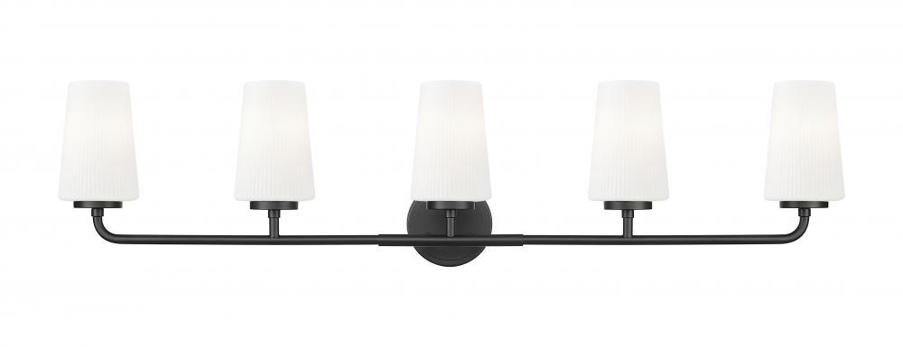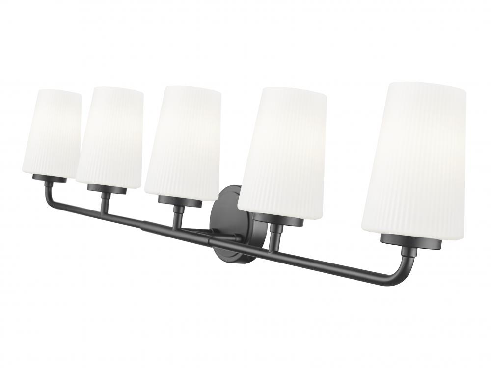 Cool matte black finishing over a steel frame creates bold definition for this modern five-light vanity wall light. Its clean, simple silhouette evokes industrial or restoration design ideals, while easily complementing a variety of decor styles. Tall, tapering shades are crafted in ribbed opal glass for excellent texture and light diffusion.