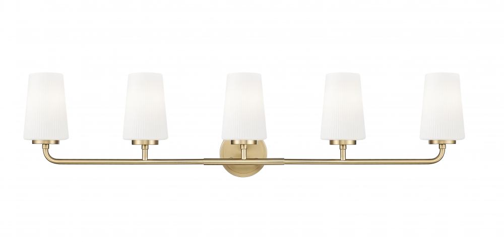 Put finishing touches on your bathroom redesign with this impressive modern five-light vanity wall light. In a modern gold finish, it blurs the line between vintage and contemporary design schools, creating a chic look and feel over your vanity. Ribbed opal glass diffuses light for excellent ambiance, while a tall, tapering shade profile enhances the overall look of this charming sconce.
