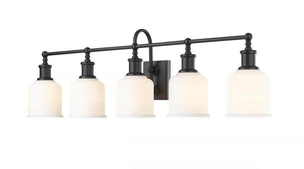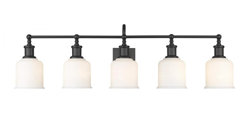 Add radiant lighting to a master or guest bath space with this stylish five-light vanity light from the Bryant collection. A gooseneck arm pads the vintage nautical aesthetic of this chic light that features a frame and holders made of matte black finish steel. Lipped opal glass shades continue its soft style and add an artful emphasis.