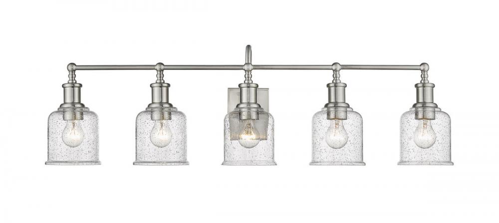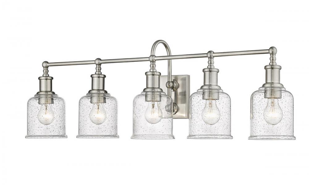 Add radiant lighting to a master or guest bath space with this stylish five-light vanity light from the Bryant collection. A gooseneck arm pads the vintage nautical aesthetic of this chic light that features a frame and holders made of cool brushed nickel finish steel. Lipped clear seedy glass shades continue its soft style and add an artful emphasis.