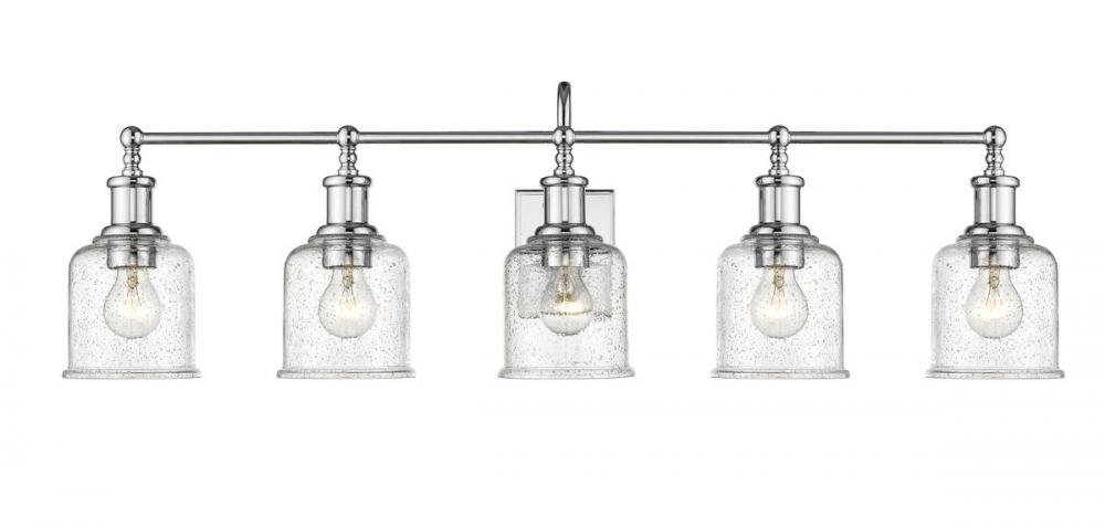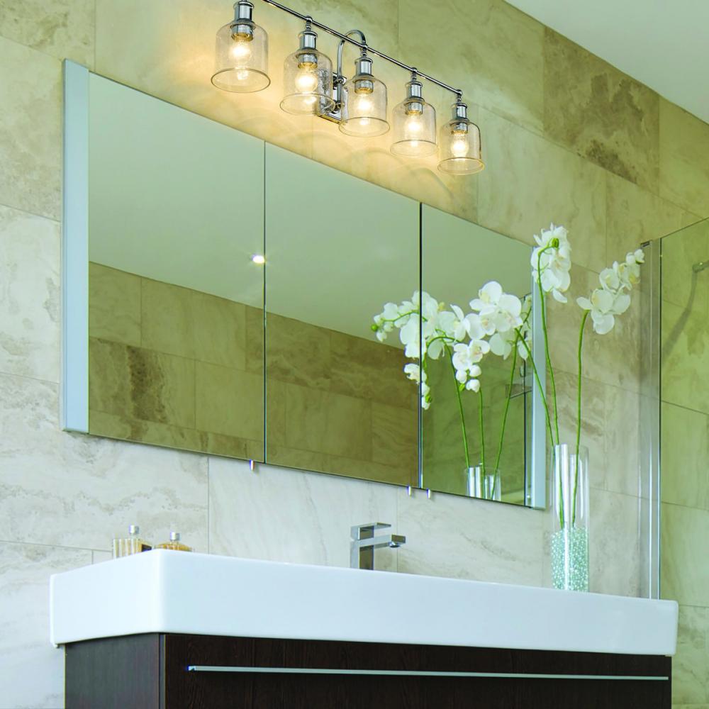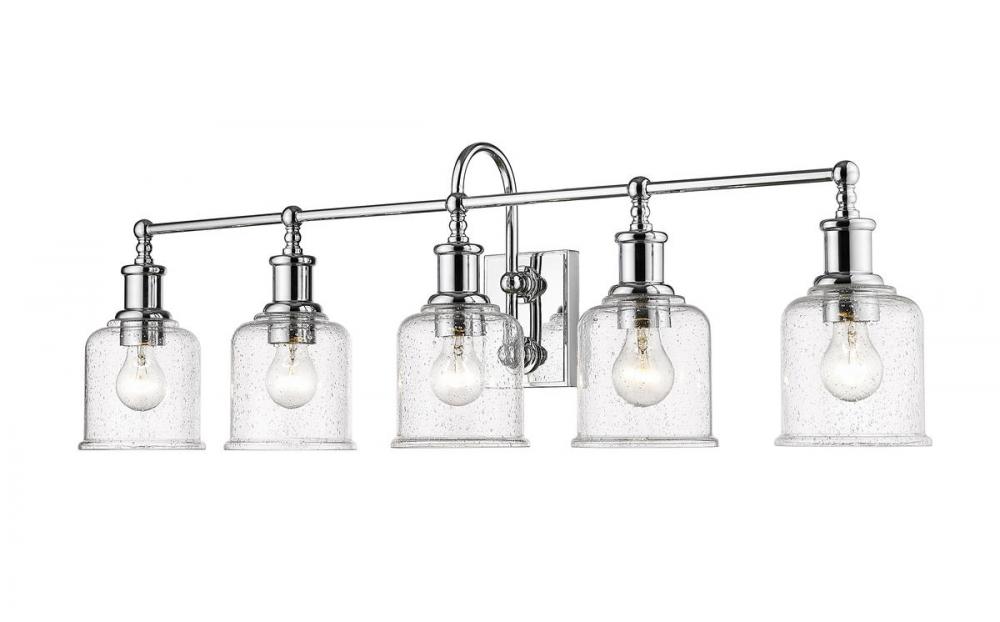 Add radiant lighting to a master or guest bath space with this stylish five-light vanity light from the Bryant collection. A gooseneck arm pads the vintage nautical aesthetic of this chic light that features a frame and holders made of radiant chrome finish steel. Lipped clear seedy glass shades continue its soft style and add an artful emphasis.