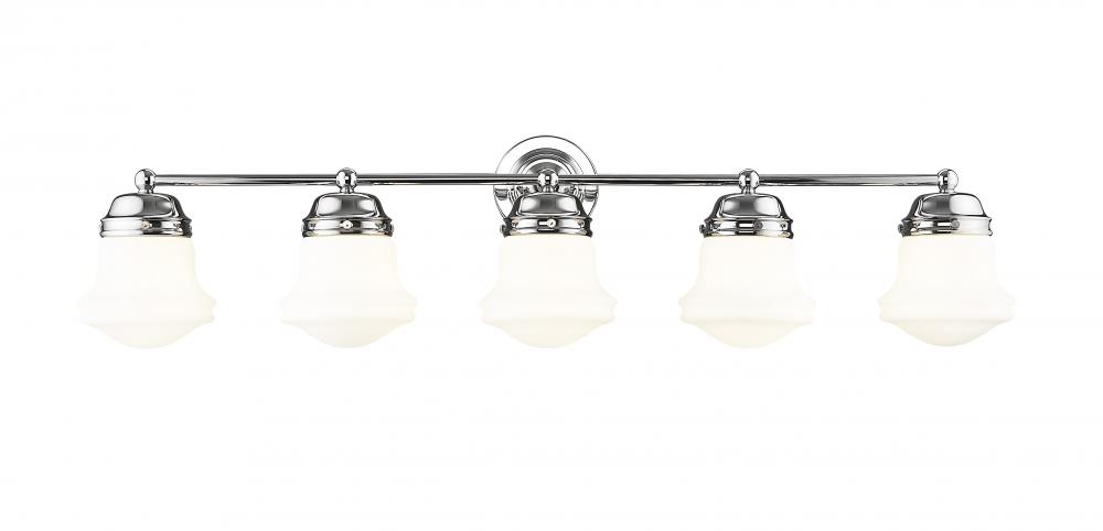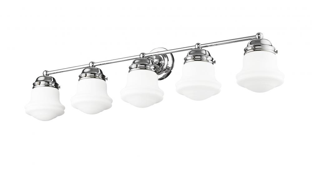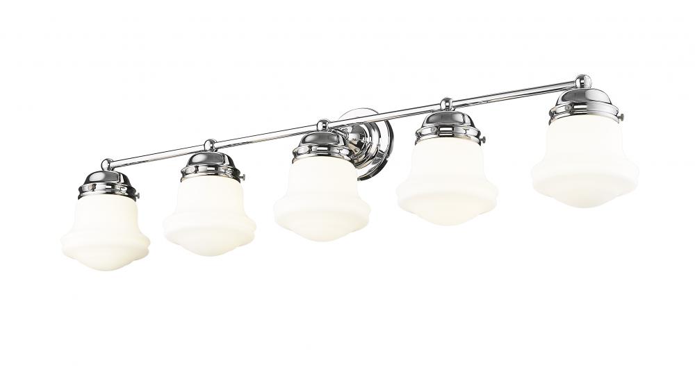 Span our vanity with a modern five-light bathroom fixture that pairs vintage schoolhouse glass with graceful curves to create a chic look and feel. Perfect for a variety of spaces, it showcases matte opal glass for exceptional, diffused illumination and pairs with a stylish chrome finish to create a rich, refined ambiance in your bath.