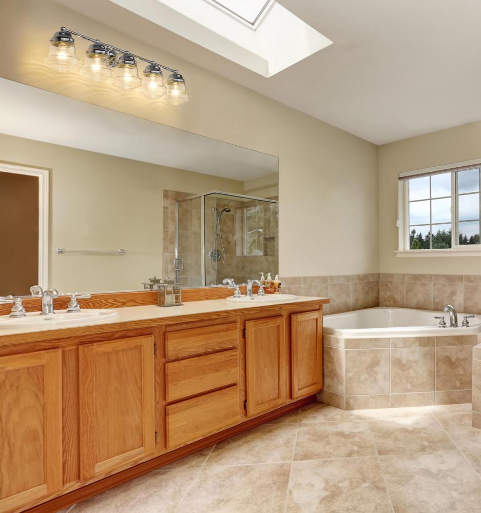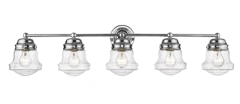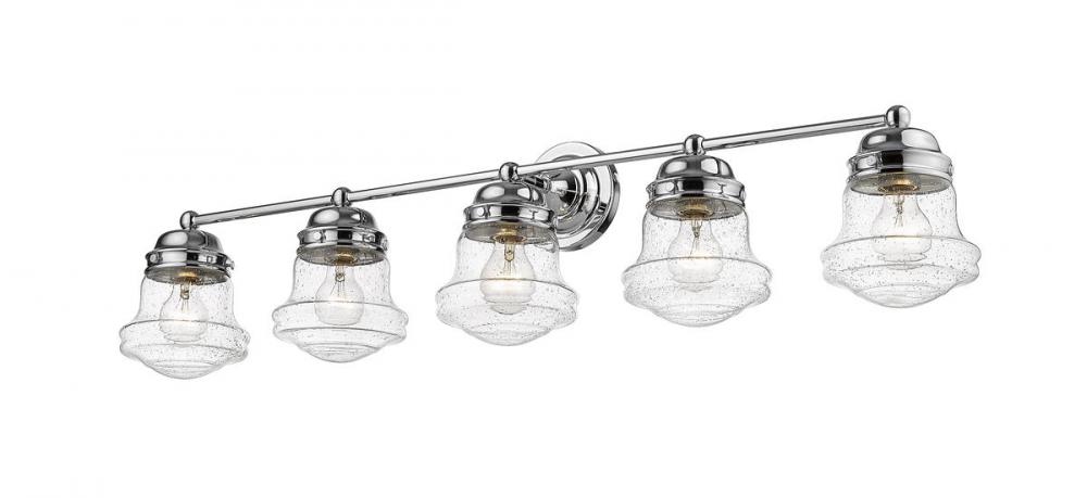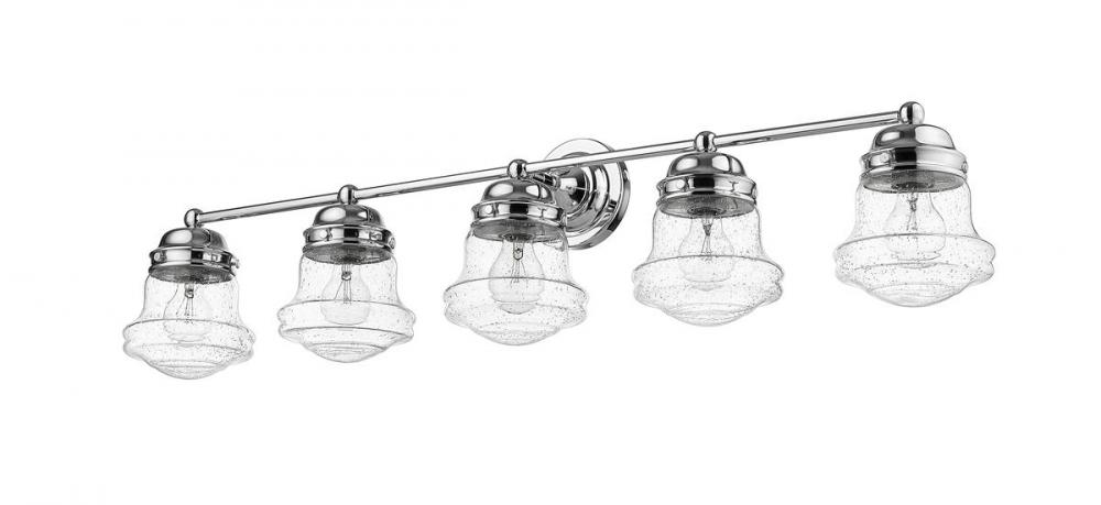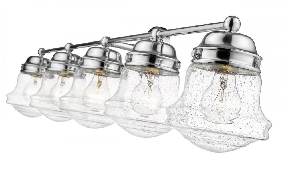 A large vanity calls for big style, and this transitional five-light bath vanity light delivers. With a charming village industrial motif, it incorporates a bit of nautical attitude and contrasts gleaming chrome finish steel with unique schoolhouse style shades made of romantic clear seedy glass. This light from the Vaughn collection transforms the overall aesthetic of any bath space.