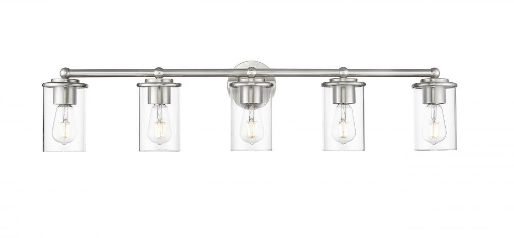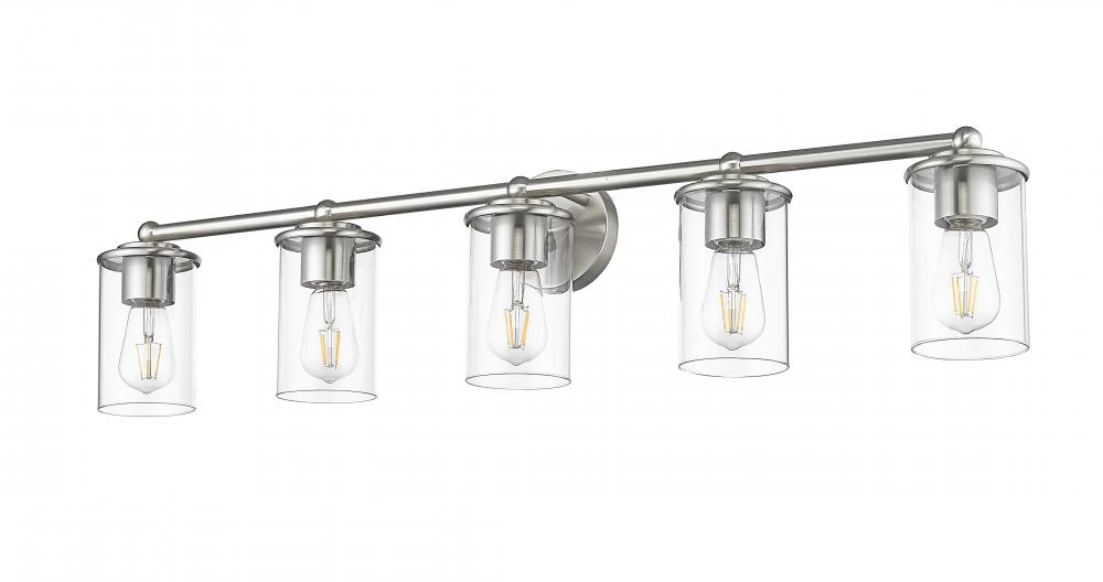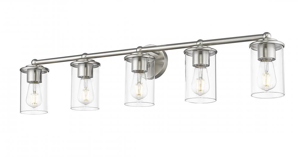 Span a large vanity with the impressive illumination of a five-light bath fixture. Its modern build features gentle curves and understated ambiance, brimming with elegance in a brushed nickel finish that pairs perfectly with smooth, clear glass.