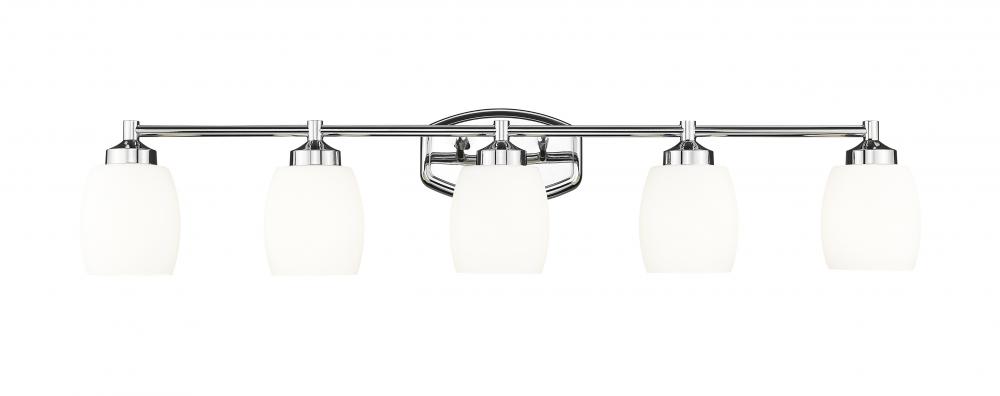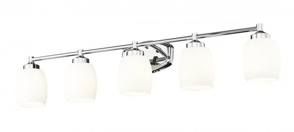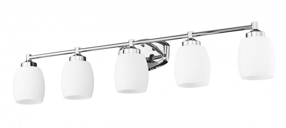 Enjoy the bright, gleaming chrome finish featured on this modern five-light vanity fixture. From the Kendrick collection, its a charming, understated design that pairs a rounded wall plate with round shades, offering soft, inviting aesthetics to any bath. Matte opal glass delivers inviting illumination thats never harsh, perfect for morning and evening grooming.