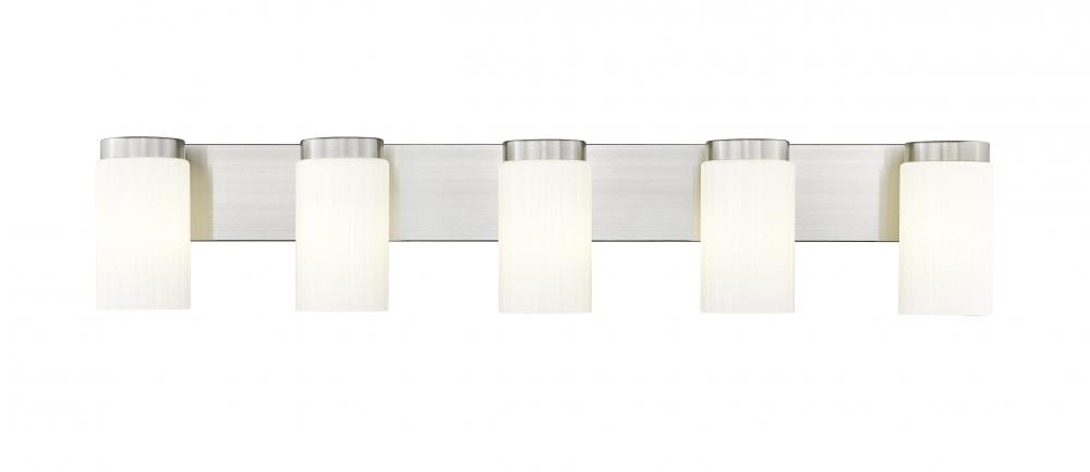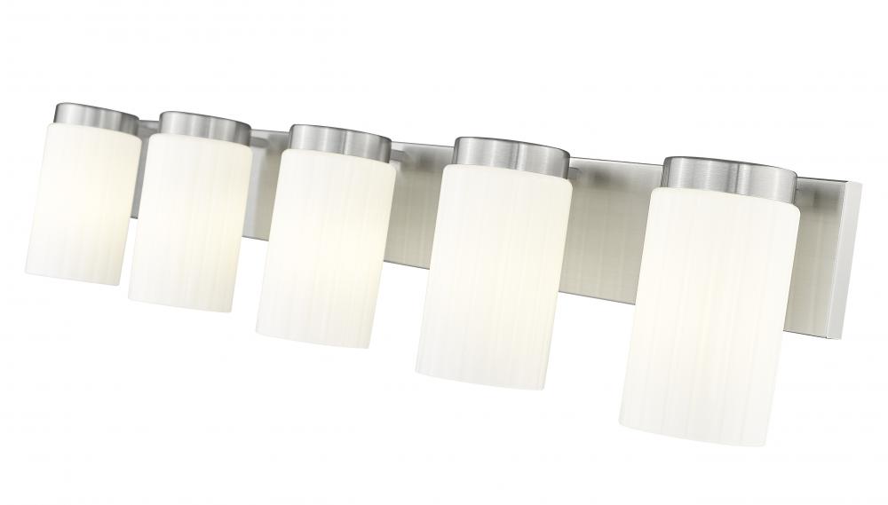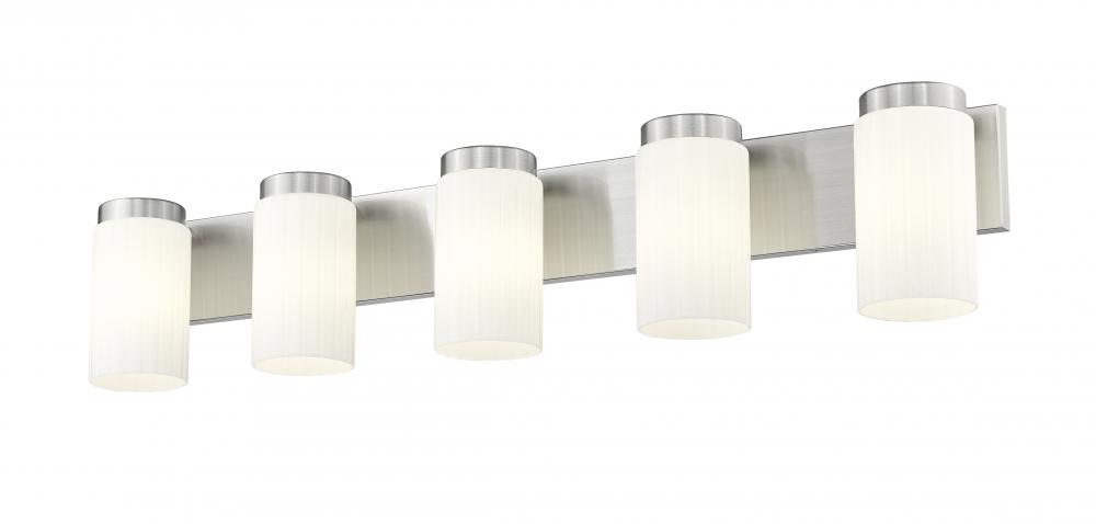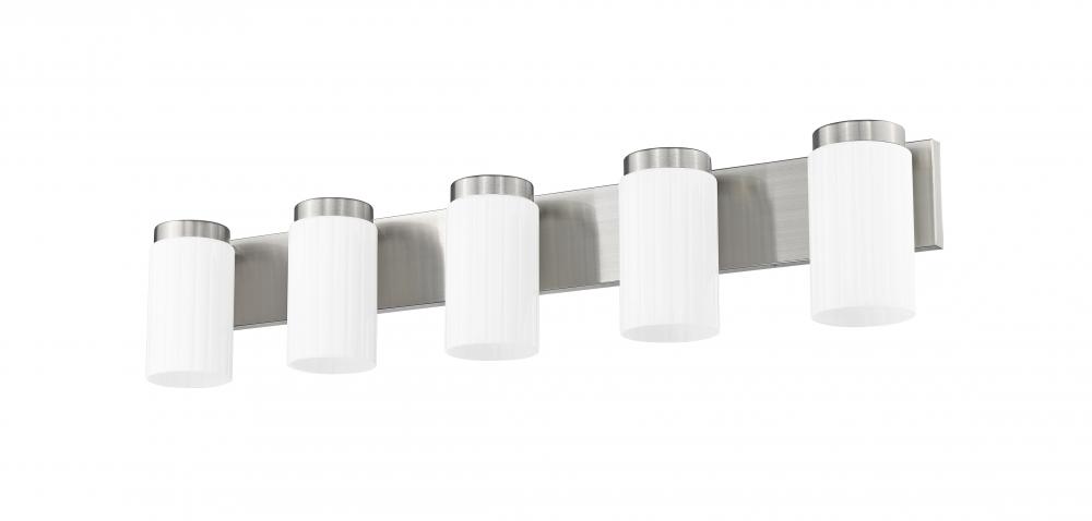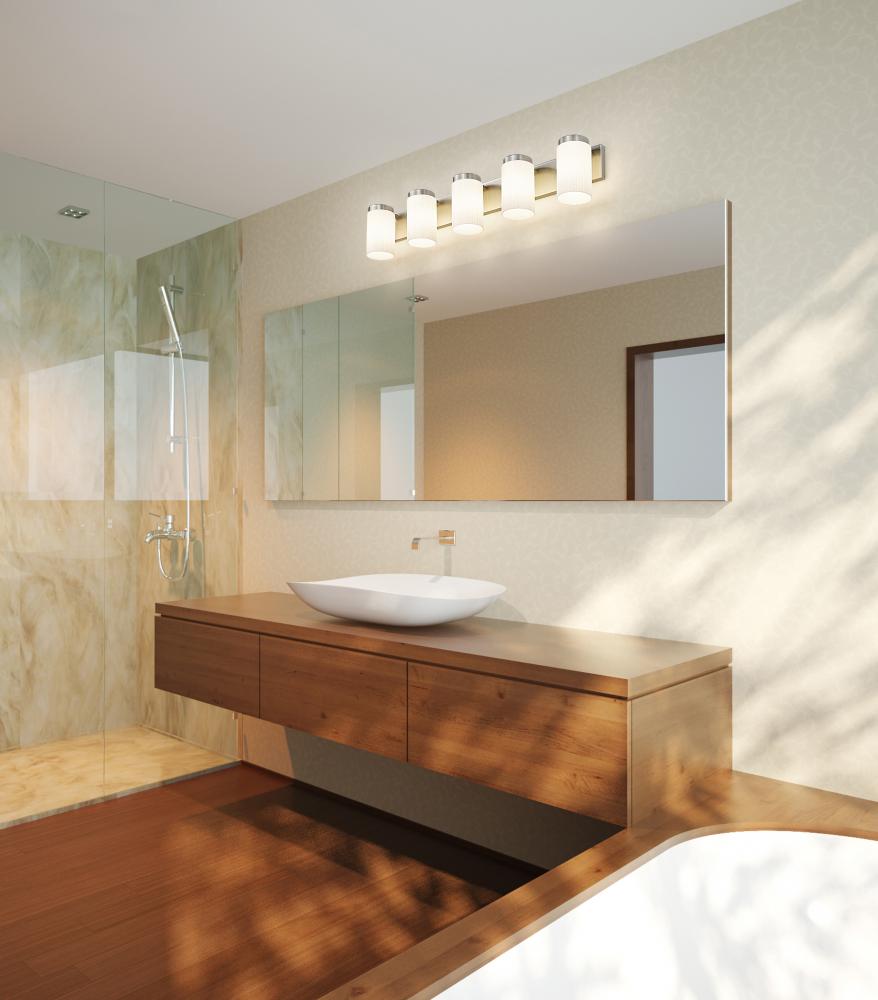 Sleek and clean, this modern five-light vanity fixture elevates your space with the Zen-inspired simplicity. Five cylinders of clear opal glass diffused illumination while a straight backplate and wide bands receive a brushed nickel finish. Its a sophisticated dose of simple elegance, perfect spanning a large vanity counter or a pair of sinks to create a fresh, welcoming look and feel.