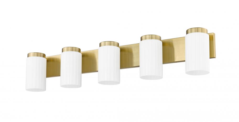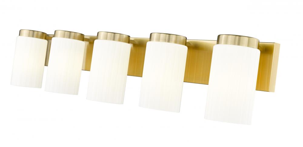 Instill sleek sophistication with the blend of clean-lined design and a rich luxe gold finish featured in this modern five-light vanity fixture. Its wonderful warmth is complemented with beautiful illumination, which filters through opal glass cylinders to create an inviting ambiance for relaxation and grooming tasks.