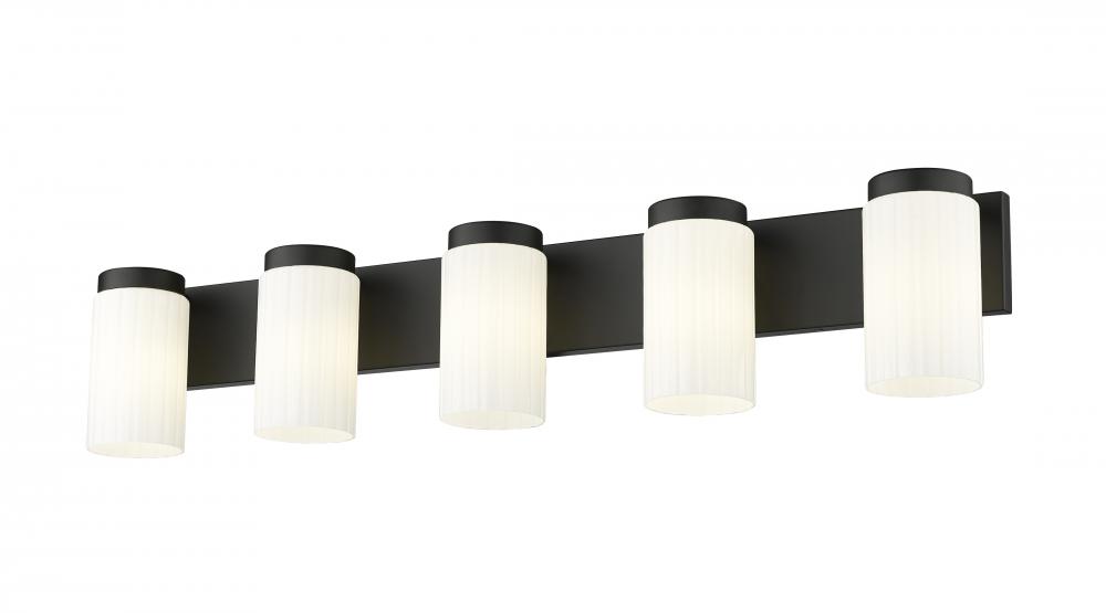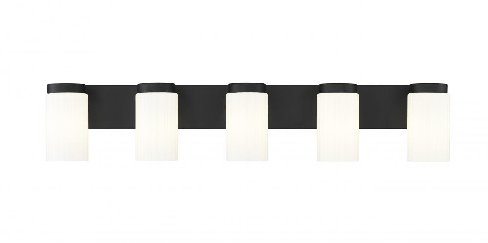 Enjoy the depth and chic simplicity of a modern five-light vanity fixture. Designed with strong, clean lines, this vanity is embellished with a matte black finish that offers fresh contrast and depth. Shades are opal glass, with a cylindrical silhouette that offers inviting appeal over any vanity or counter.