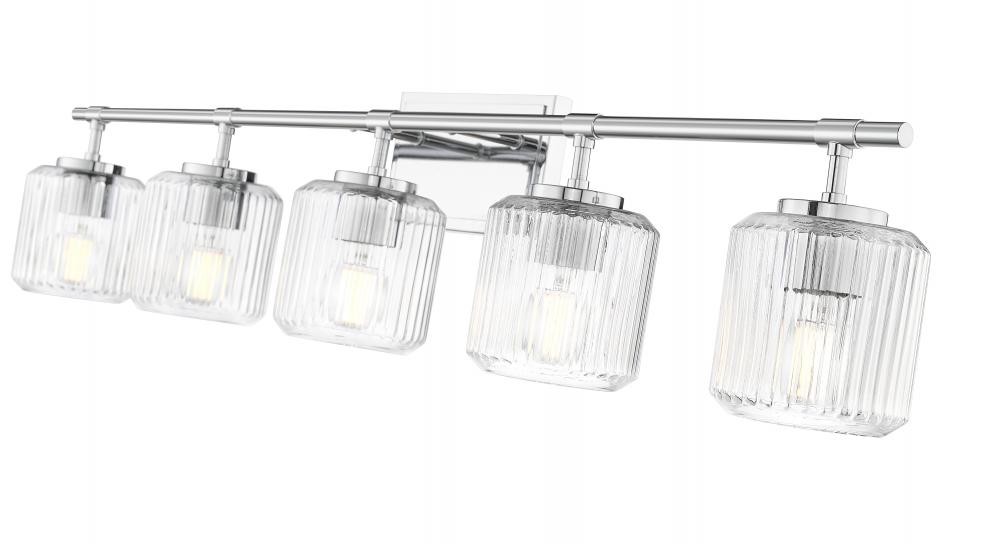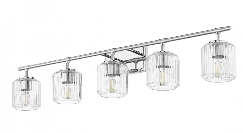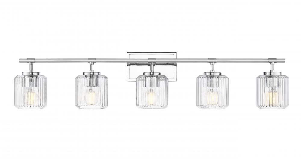 A robust structure and mirror-like chrome finish create bold style for this modern five-light vanity bath light. Its gleaming effect is paired with ribbed clear glass shades, delivering an undulating effect that brings dimension and movement over your sink and counter. Clean lines and simplicity of design ensure that this fixture complements in any setting.