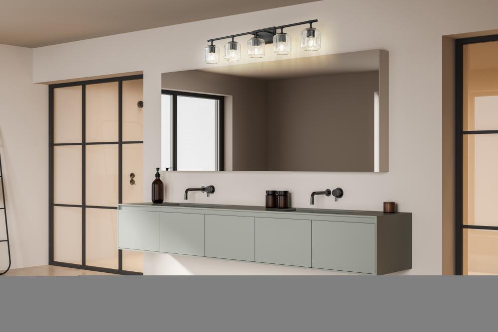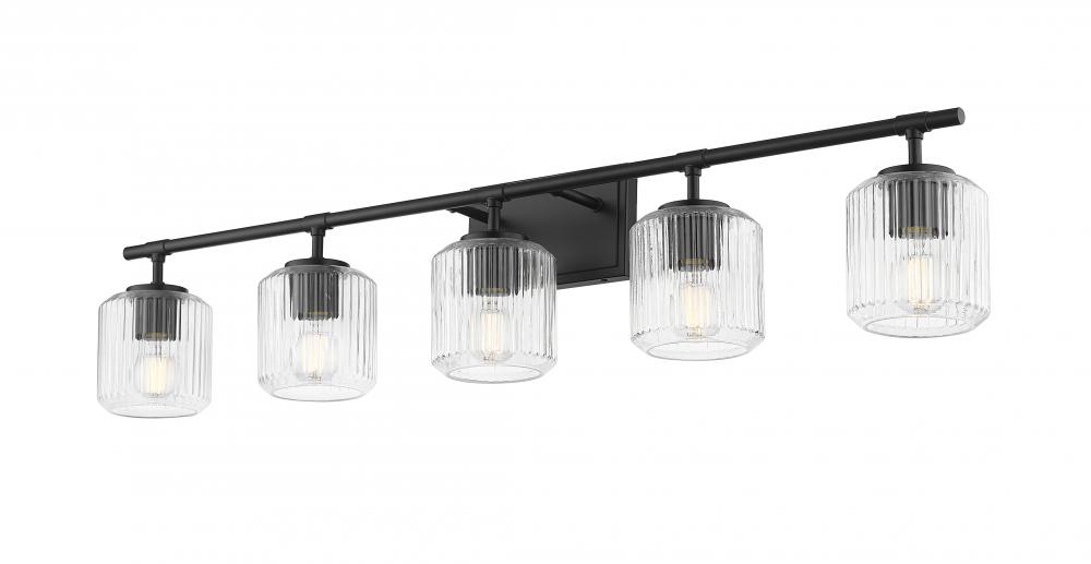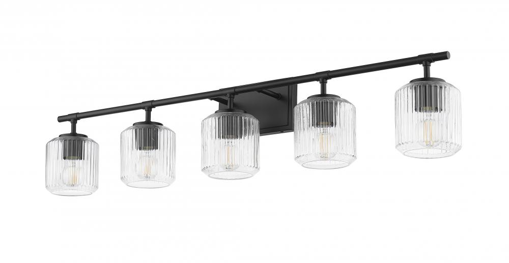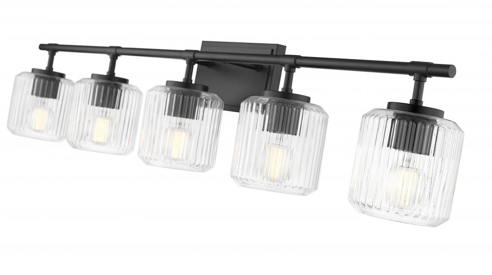 Matte black finishing brings robust style and contrast to the clean, structured design of this modern five-light vanity bath light. Its refined look is enhanced with the sparkling sophistication of its five clear glass shades. Delicate ribbed glass creates a touch of movement and adds resplendent sparkle and elegance.