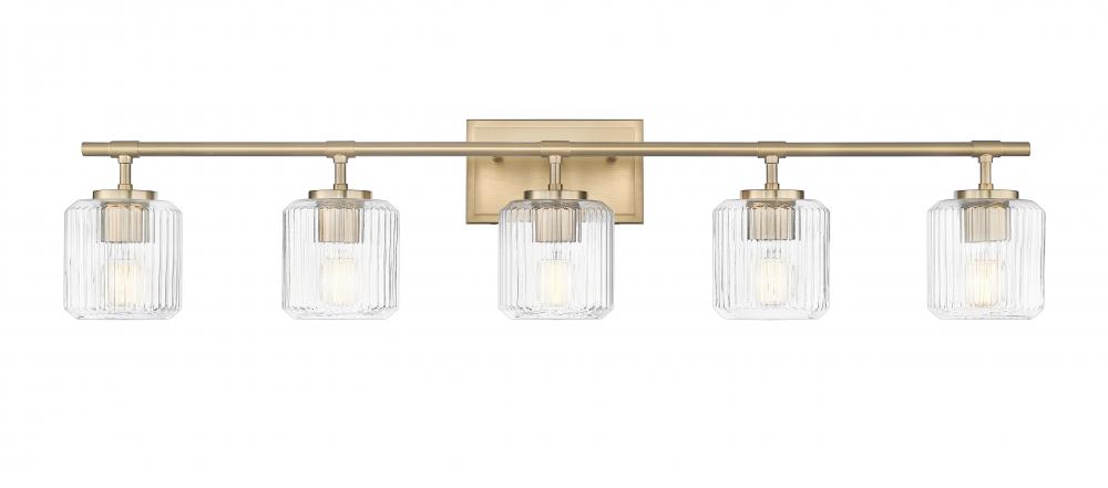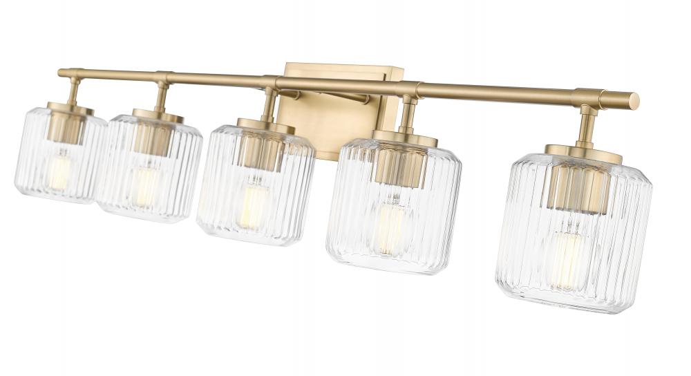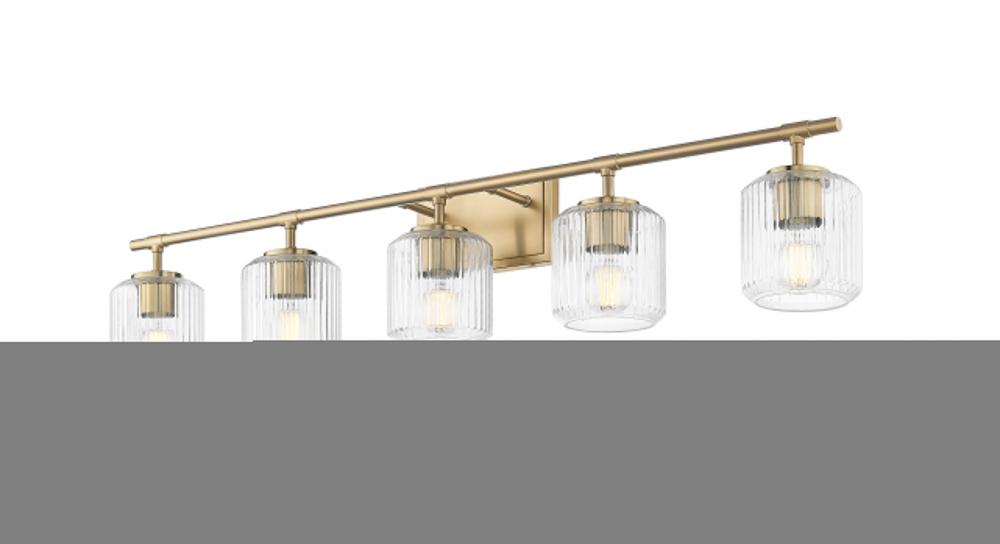 Augment a refined, inviting bath with this contemporary five-light vanity bath light with a rich modern gold finish. Its richness is enhanced with the subtle sparkle of clear ribbed glass shades, creating a soft undulating effect in your space.