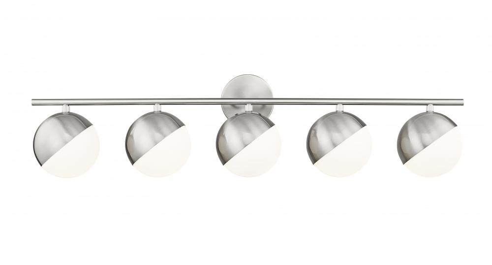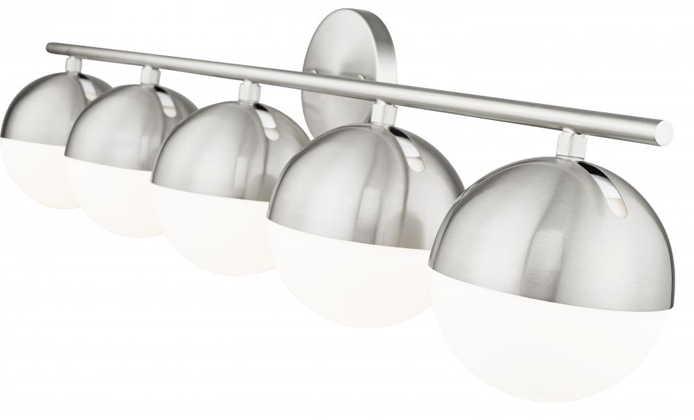 Light a large en suite with the impressive span of this mid-century five-light vanity bath light. Perfect for bright, glare-free illumination, it features orbs shades of matte opal glass, complete with metal shields for a clean, fresh look and feel. A brushed nickel finish adds sleek sophistication.