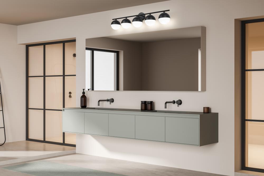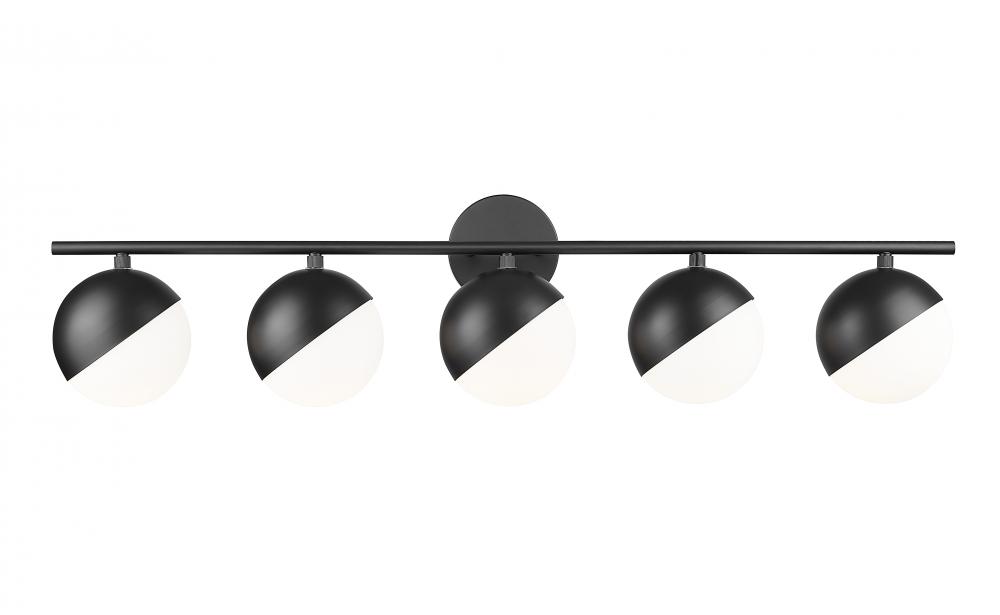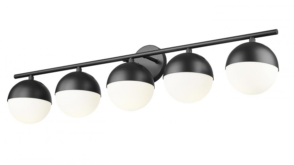 Augment a primary or guest en suite with the bright illumination of this mid-century five-light vanity bath light. It showcases a linear silhouette complete with a matte black finish, maximizing contrast and character over your vanity. Its opal glass orb shades cast soft, diffused illumination, while metal shields add depth and dimensionality.