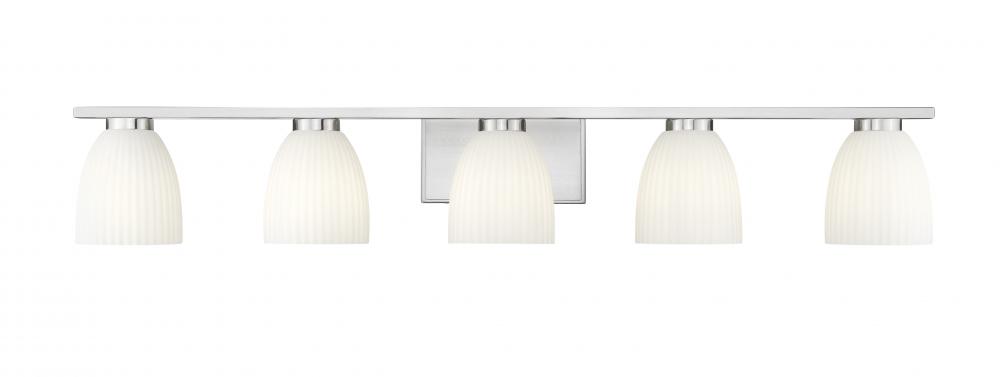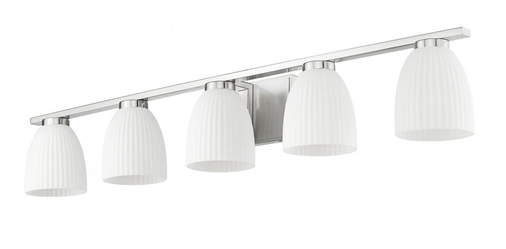 Cool brushed nickel gives this five-light vanity fixture a crisp, tailored edge, balanced by the softness of matte opal glass. Ribbed shades create a diffused glow that flatters without overpowering. It brings a quiet sense of clarity to everyday routines.
