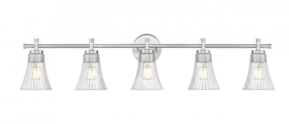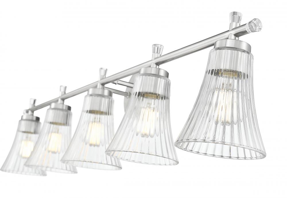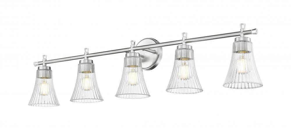Cool and understated, this five-light vanity fixture pairs a brushed nickel finish with glistening fluted glass for a look that?s equal parts refined and romantic. The crystal-inspired clear glass shades create a glow that feels light, airy, and endlessly polished. It?s a timeless accent for spaces that call for quiet beauty.