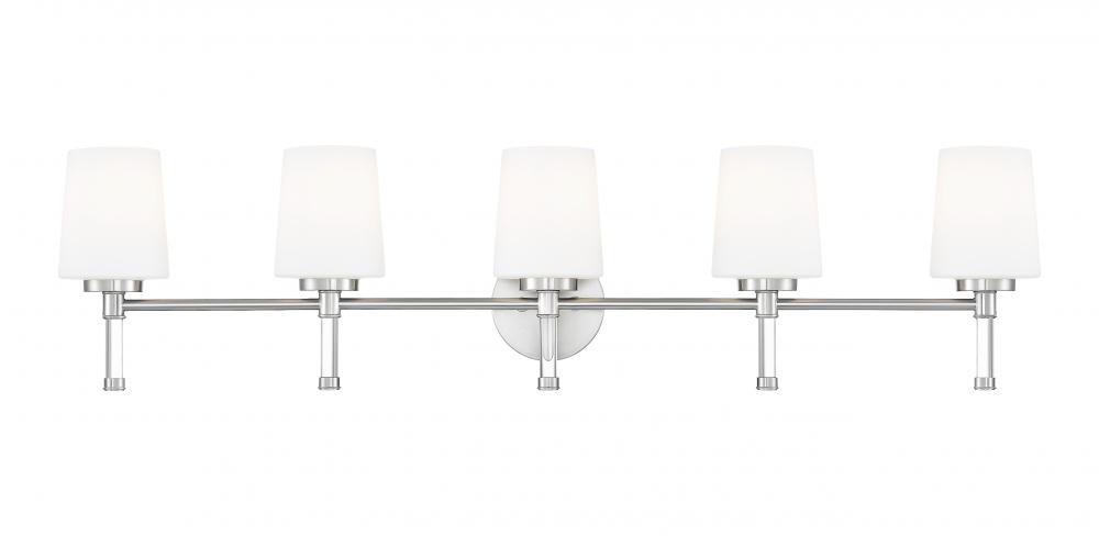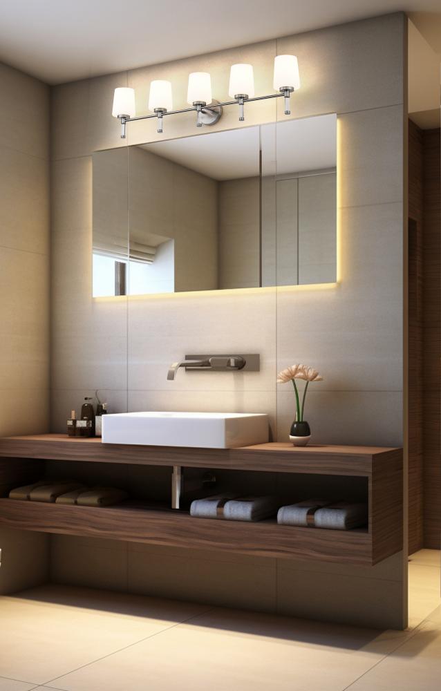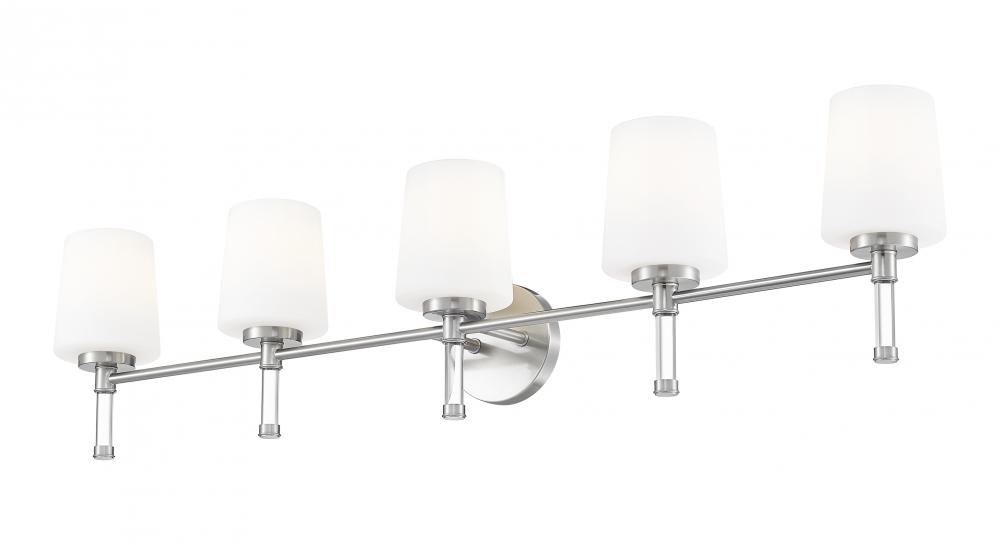 Lined up like a row of candles, five opal shades on brushed nickel give the mirror wall a gracious, expansive glow that feels right at home in a spacious primary bath. Stretching confidently across double sinks or long counters, this brushed nickel five-light vanity light keeps the space consistently lit for mornings that start early and evenings that end late.