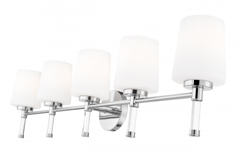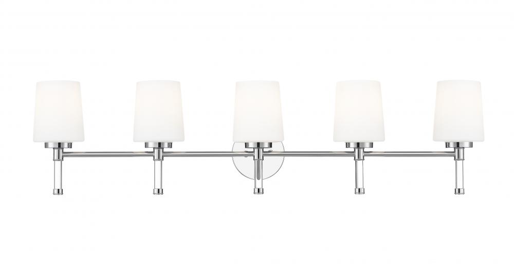 A sweep of gleaming chrome and five glowing shades brings a touch of penthouse glamour to even a simple bath. Because this chrome five-light vanity light reflects tile, mirror, and hardware all at once, it turns the vanity wall into a lively focal point that sparkles during busy mornings and softens beautifully when dimmed at night.