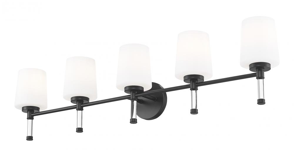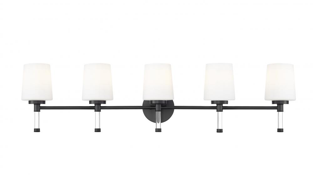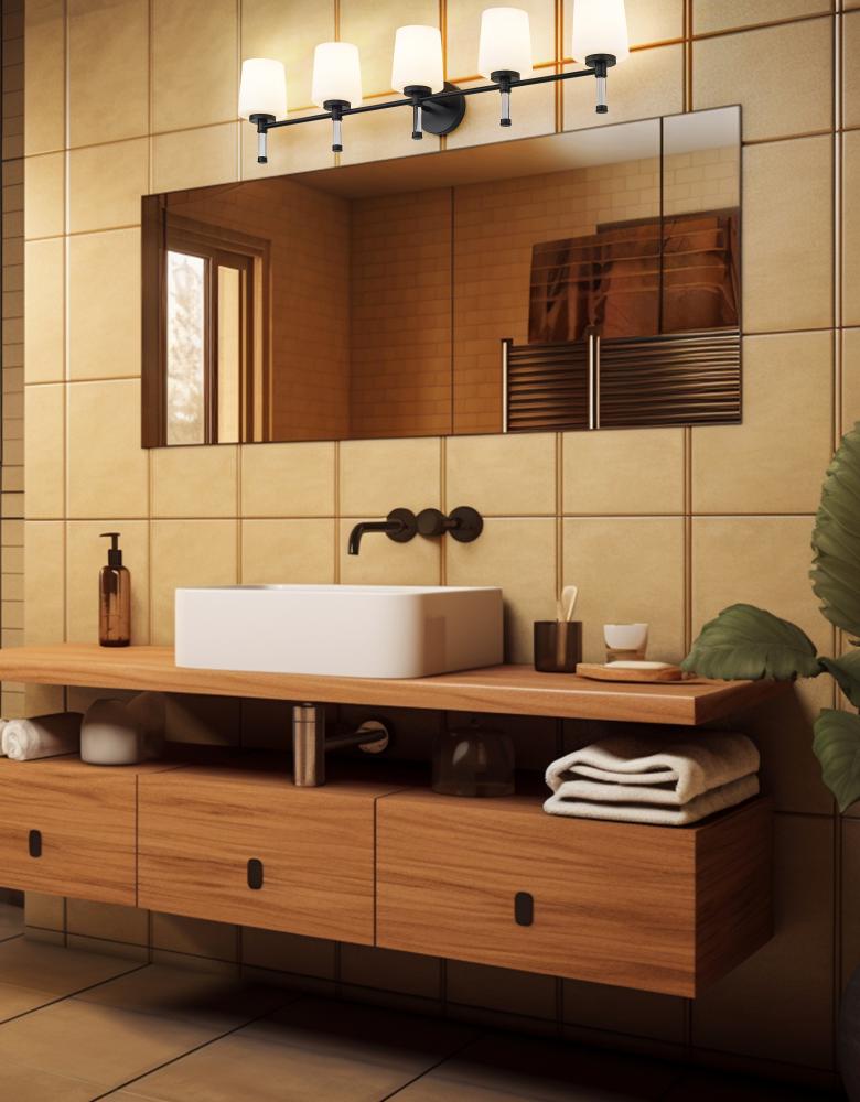 Against pale tile or painted cabinets, the deep finish of this matte black five-light vanity light traces a strong horizontal line that gives the room a bit of gallery drama. Five opal glass shades seem to float on clear stems, so the piece still feels light in spirit even as it supplies generous illumination for shared sinks and family routines. In a modern farmhouse, loft, or streamlined renovation, it bridges rustic textures and contemporary details, ensuring the whole space feels deliberate and stylish.