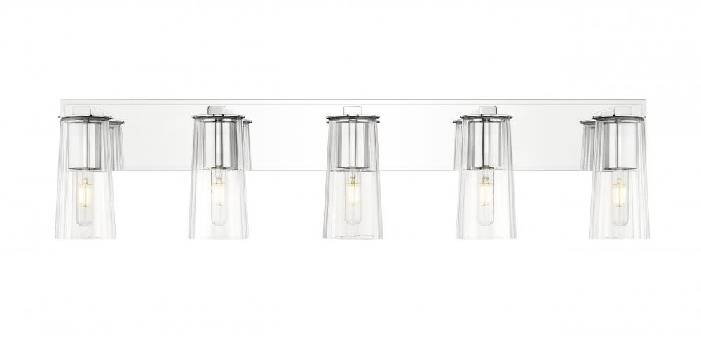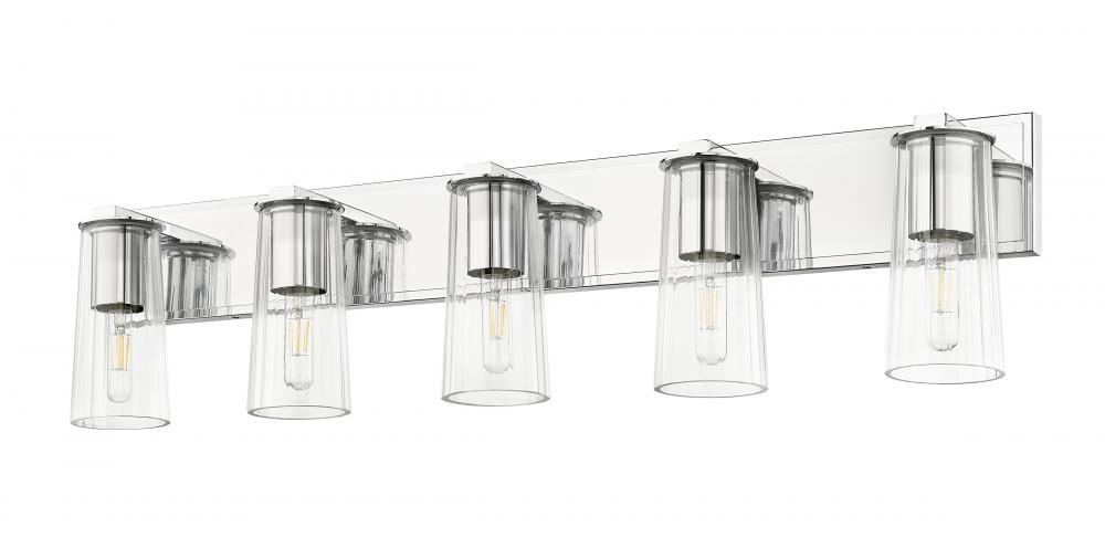 Create bright, bold illumination with a modern industrial five-light vanity fixture. A gleaming chrome finish adds contemporary allure, while clear glass shades with a tapered silhouette and tubular bulbs offer a vintage touch, creating compelling balance and charm.