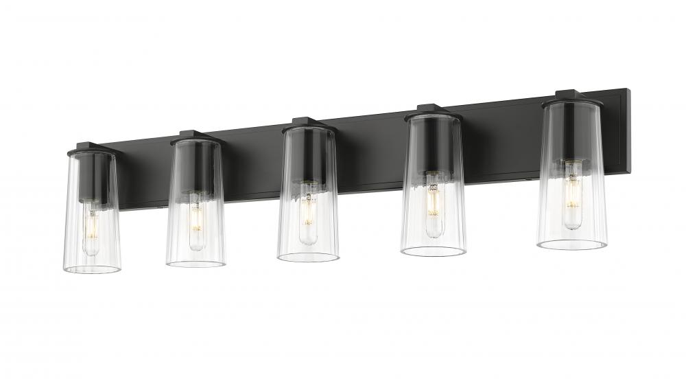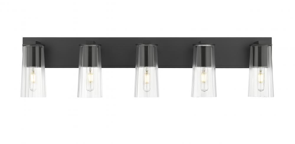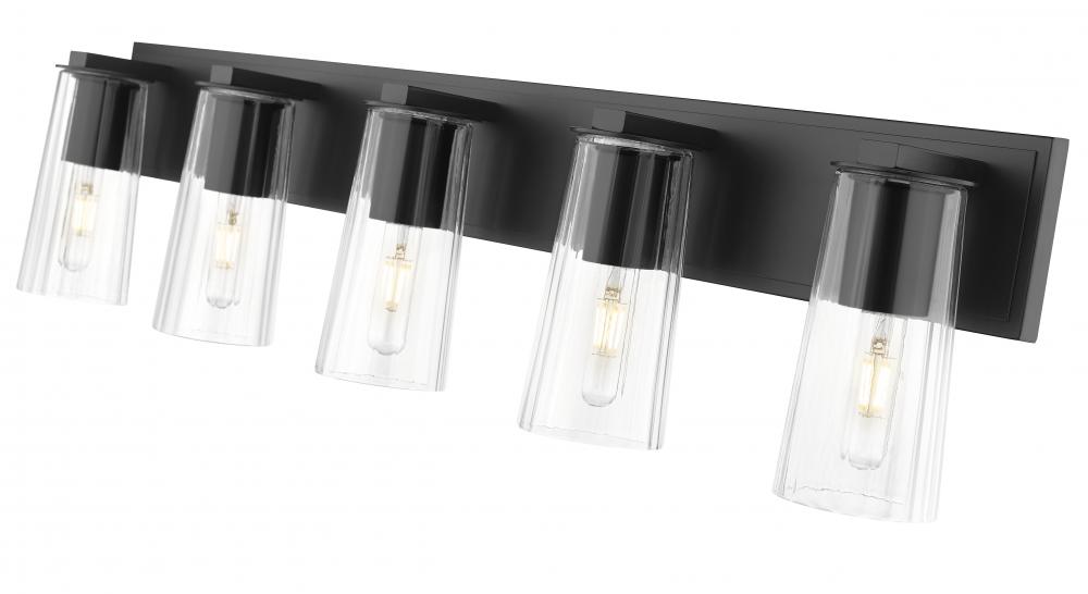 Brighten your bath while adding character with a modern industrial five-light vanity fixture. Its clean-lined silhouette features a long rectangular wall plate in a matte black finish, adding depth and contrast. Five lights are augmented with tapered clear glass shades and tubular bulbs, creating a vintage touch that adds the right dose of charm.