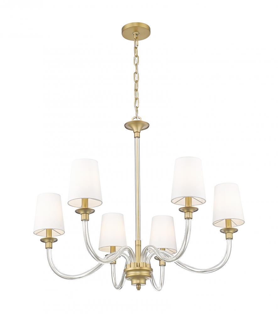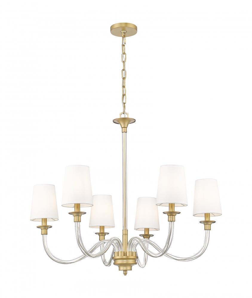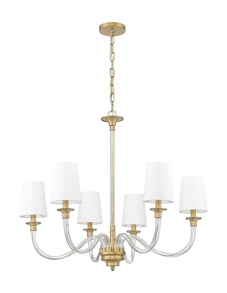 Subtle decorative details are highlighted with a warm rubbed brass finish of this modern six-light chandelier. Slender arms are fashioned in glass, adding airy lightness to the overall presentation, which hints at classical pre-war aesthetics. Tapering white fabric shades are a chic finishing touch, ensuring lovely illumination over any space.