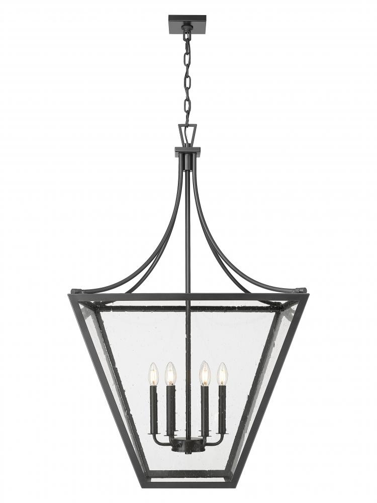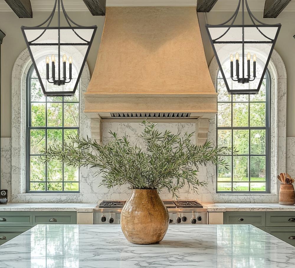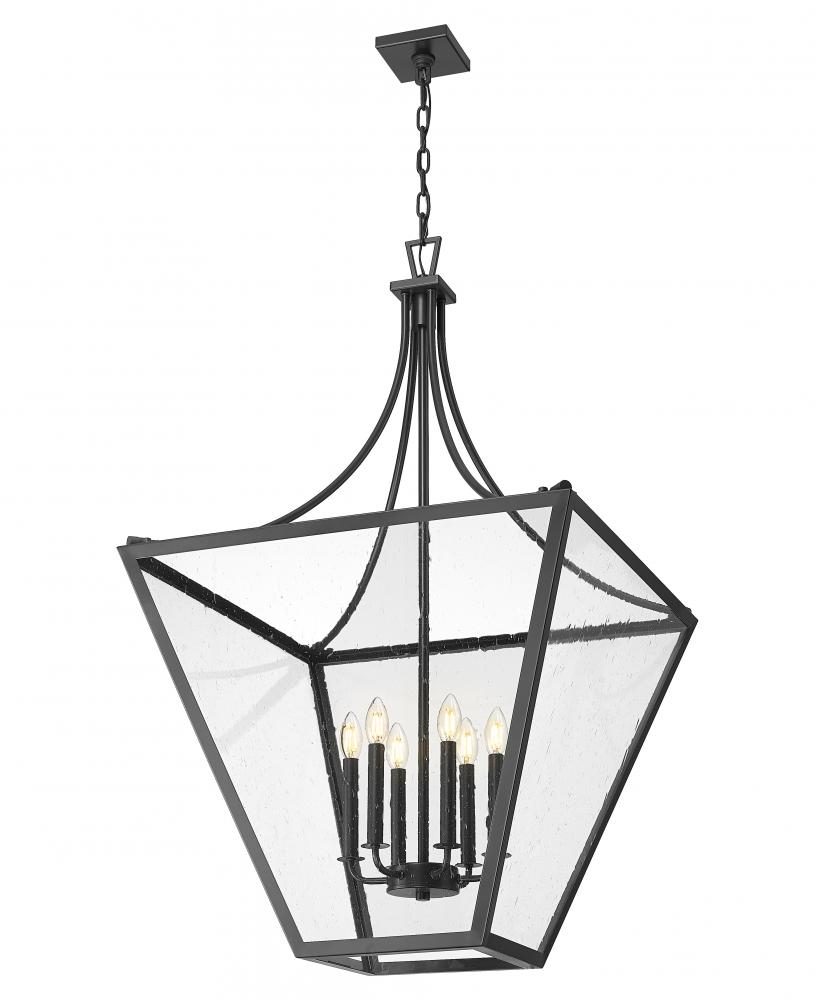 Curves and angles modify a lantern motif, changing the vibe of this six-light chandelier. Stylish framing of iron ore finish steel is met with slightly seedy glass panels, as interior candelabra-style bulb mounts throwing in a bit of romantic charm. Dimming functions make this fixture a great choice for living rooms, dining rooms, and foyers in need of variable lighting levels.