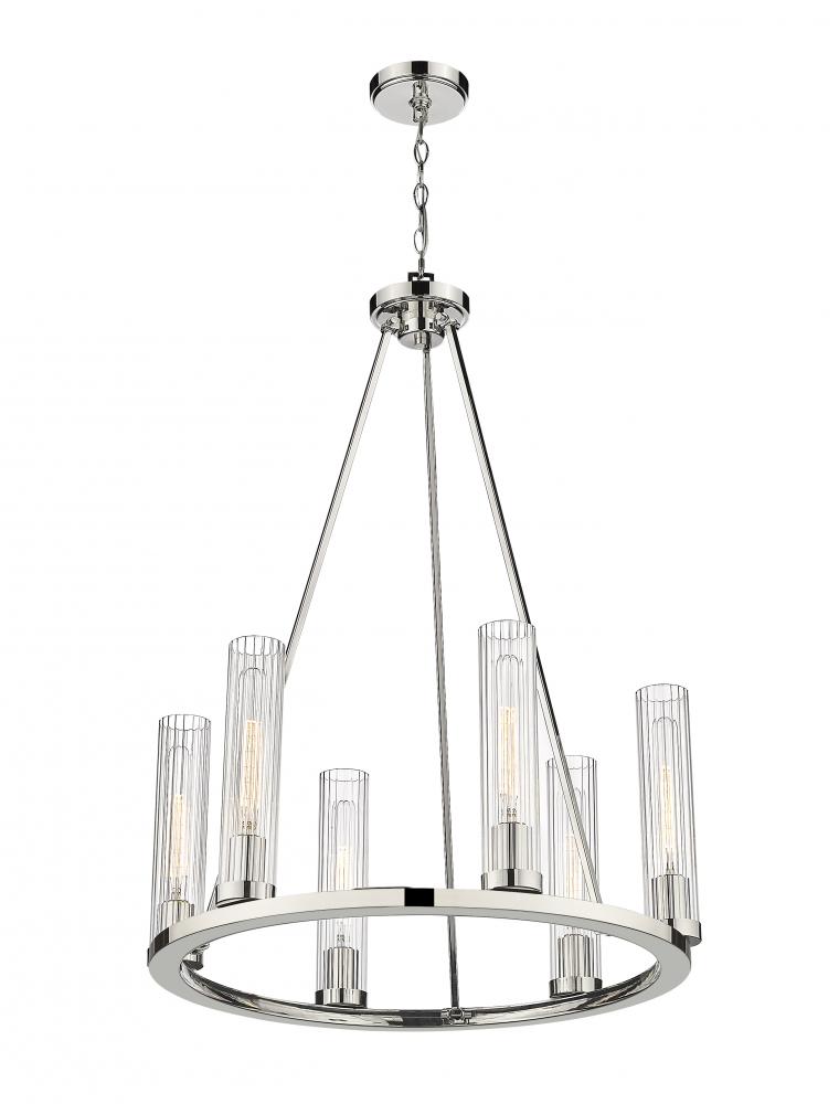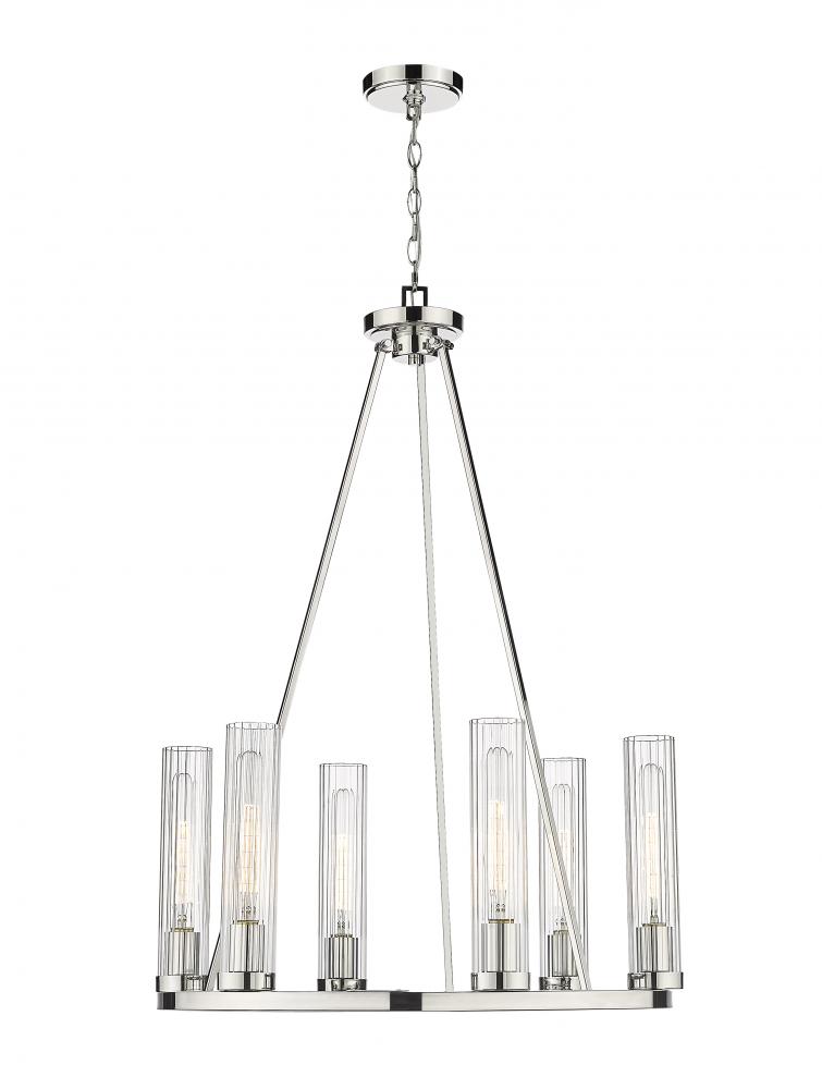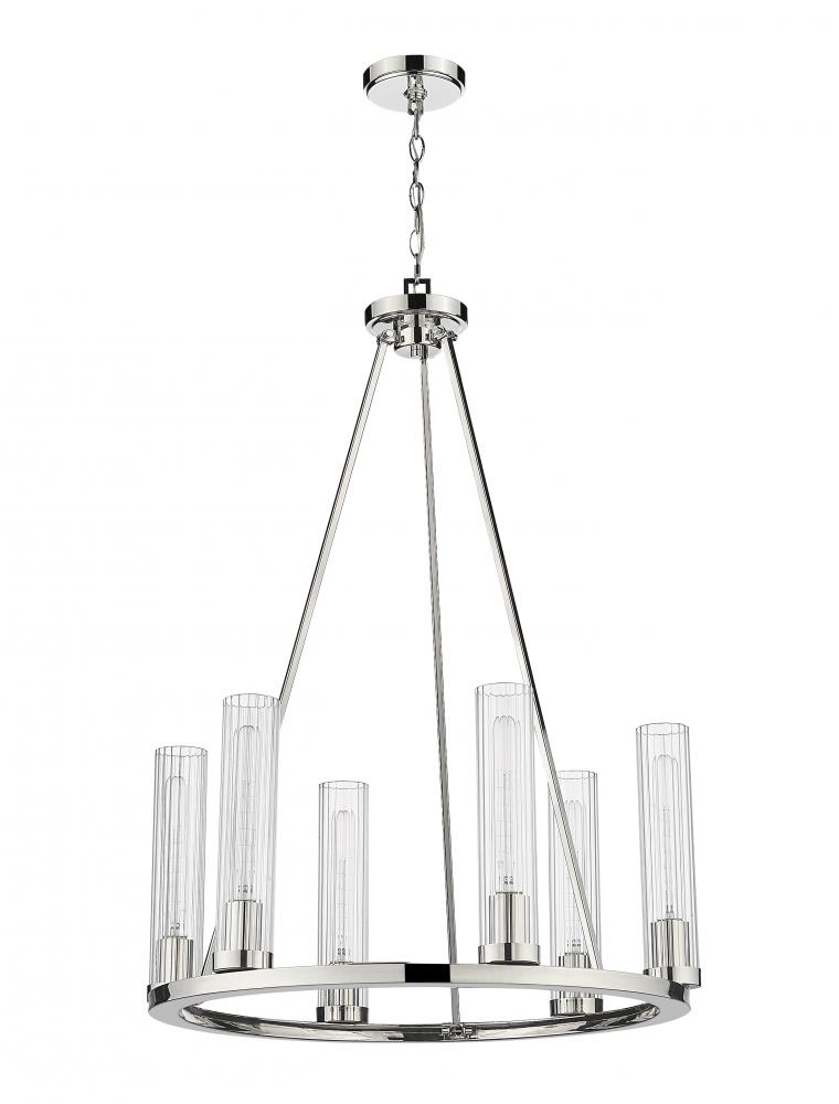 Gleaming polished nickel finish metal embellishes the sparkling glass shades that come to life in a modern space, transforming the Beau six-light chandelier into a sophisticated option for illuminating a compact living area. This design-forward fixture offers an unforgettable aesthetic with a shiny polished nickel steel frame and accents and evenly placed slender fluted glass shades. The consistency in materials speaks to an updated transitional theme that delivers versatility, a fresh feel, and a superb source of ambient lighting in a kitchen or living space.
