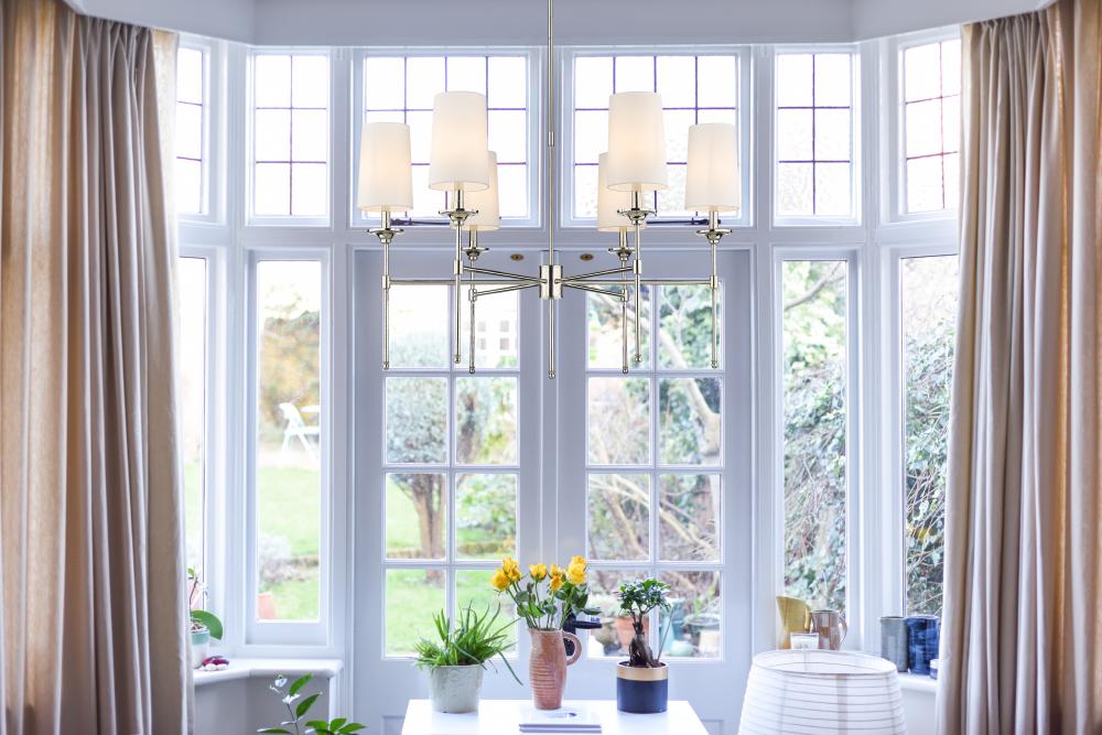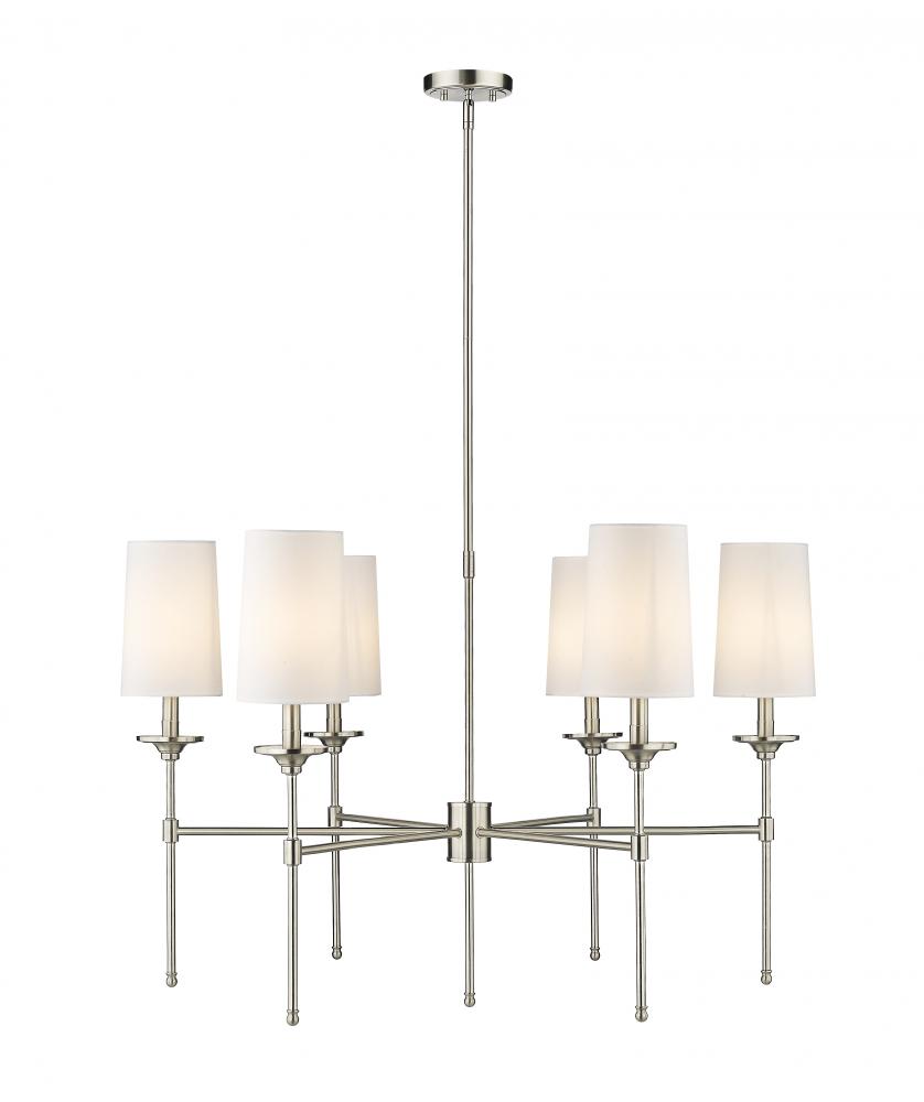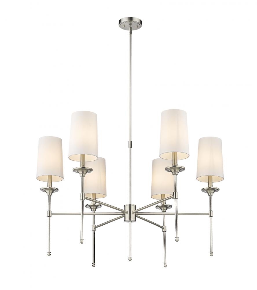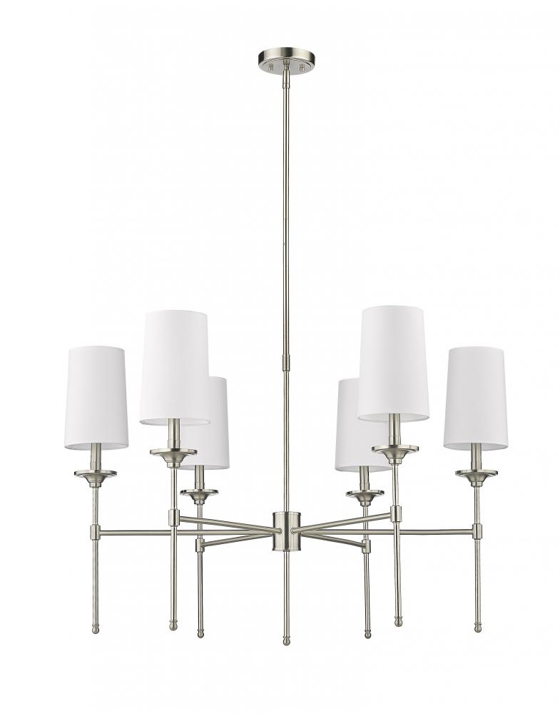 The Emily six-light chandelier presents a theatrical motif perfect for adding indulgent attitude to any transitional or modern space. Stemmed lamp-like lights with soft off-white shades complement a frame crafted of sleek brushed nickel finish metal, forming a sophisticated aesthetic suitable for the most custom dining rooms, living areas, and bedrooms.