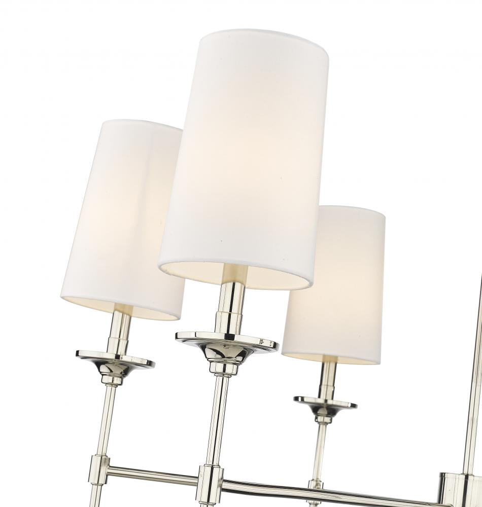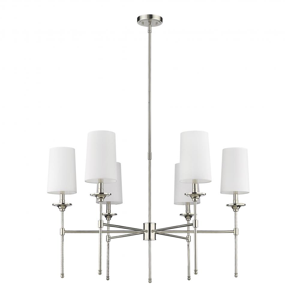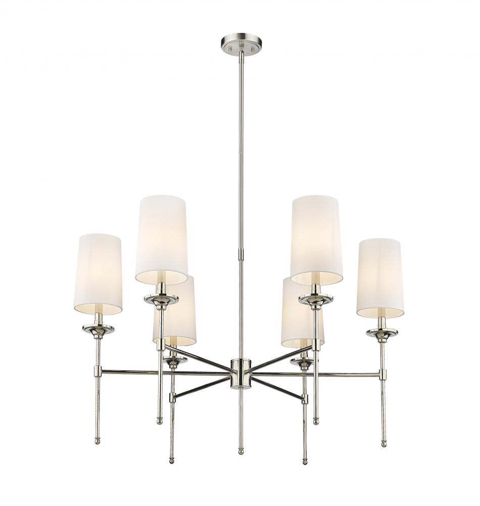 Light up a transitional space with the classic traditional look of a transitional fixture, choosing the Emily six-light chandelier as a central focus. Stemmed lamp-like lights with soft off-white shades complement a frame crafted of gleaming polished nickel finish metal, forming a sophisticated aesthetic suitable for the most custom dining rooms, living areas, and bedrooms.