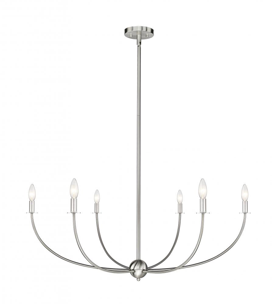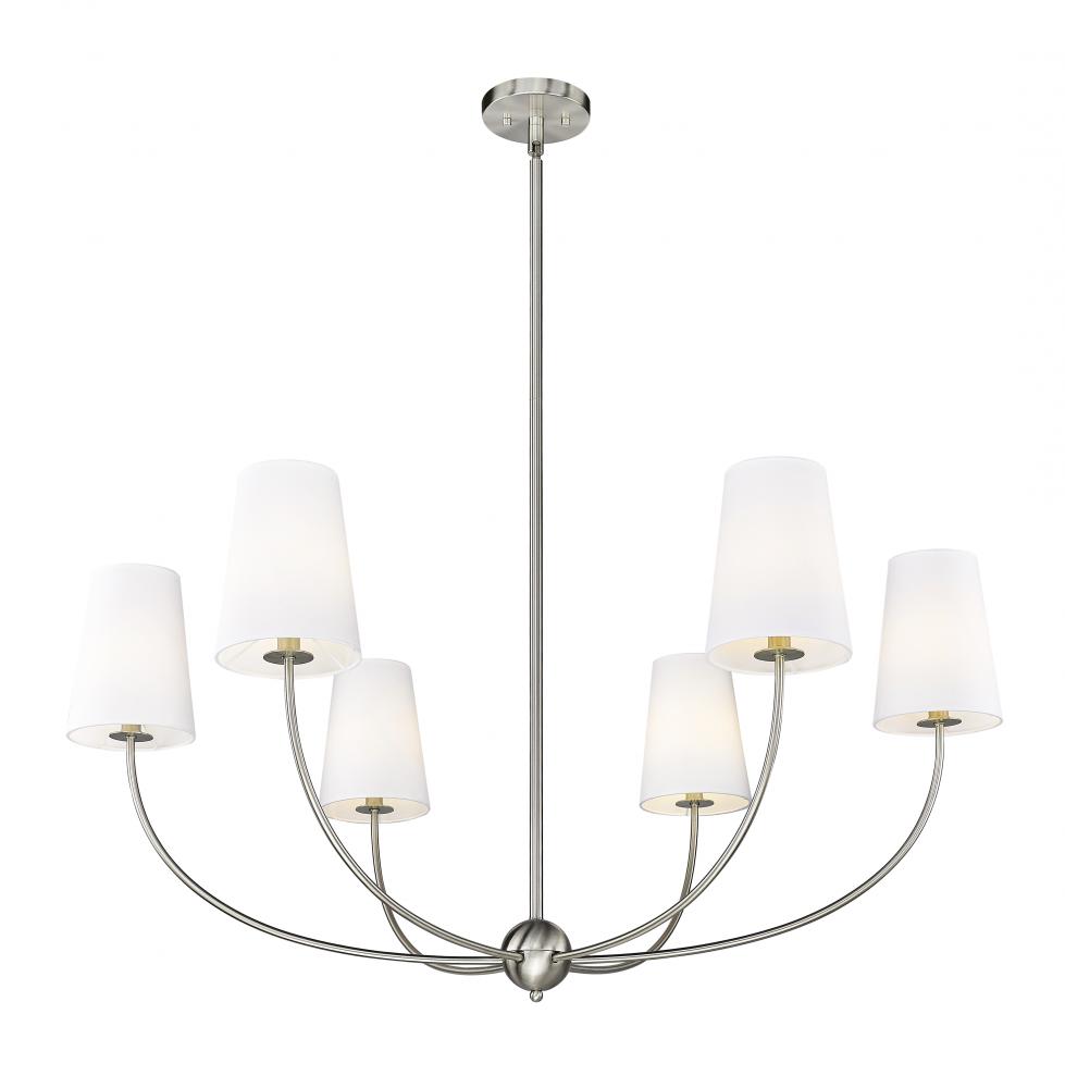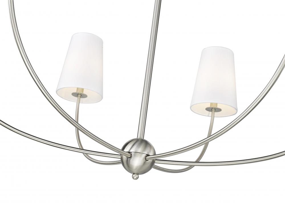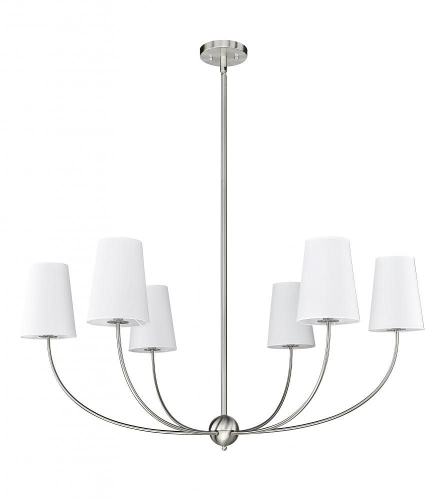 Choose the Shannon six-light chandelier to create an easy, low-key feel in a modern space. Embrace the graceful aesthetic of a brushed nickel finish steel frame with subtly curved arms and lights capped with classic white fabric shades reflecting traditional style. Infuse ambient lighting over a dining ensemble, in an entryway, or in a main living area with this tasteful chandelier.