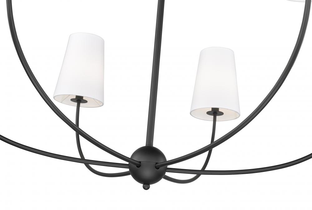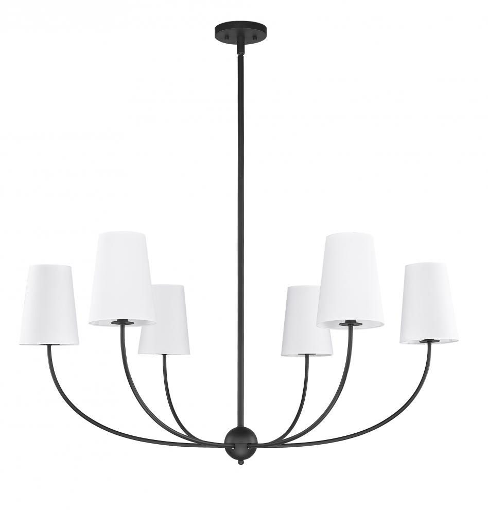 Crisp in style and contrast, the Shannon six-light chandelier becomes a focal point in any modern space. Embrace the cool aesthetic of a matte black finish steel frame with subtly curved arms and lights capped with classic white fabric shades reflecting traditional style. Infuse ambient lighting over a dining ensemble, in an entryway, or in a main living area with this tasteful chandelier.