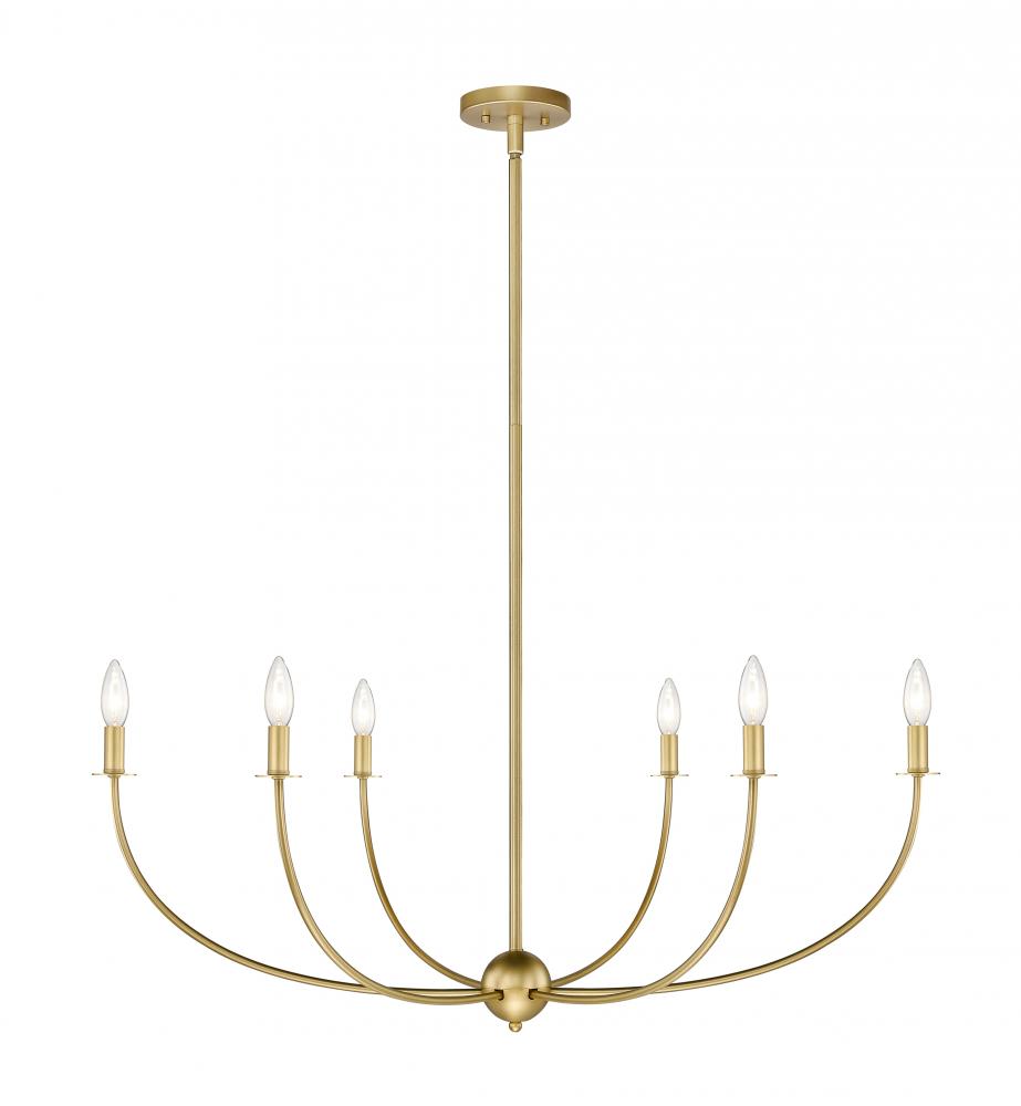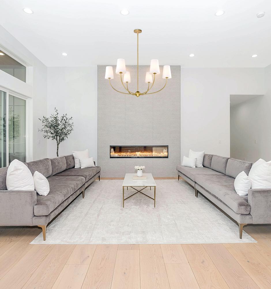 The Shannon six-light chandelier becomes a focal point in any modern space with its easy yet sophisticated aesthetic. Embrace the beauty of a rubbed brass finish steel frame with subtly curved arms and lights capped with classic white fabric shades reflecting traditional style. Infuse ambient lighting over a dining ensemble, in an entryway, or in a main living area with this tasteful chandelier.