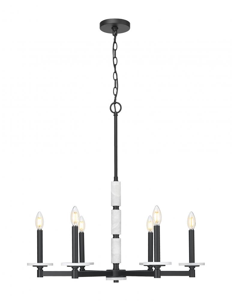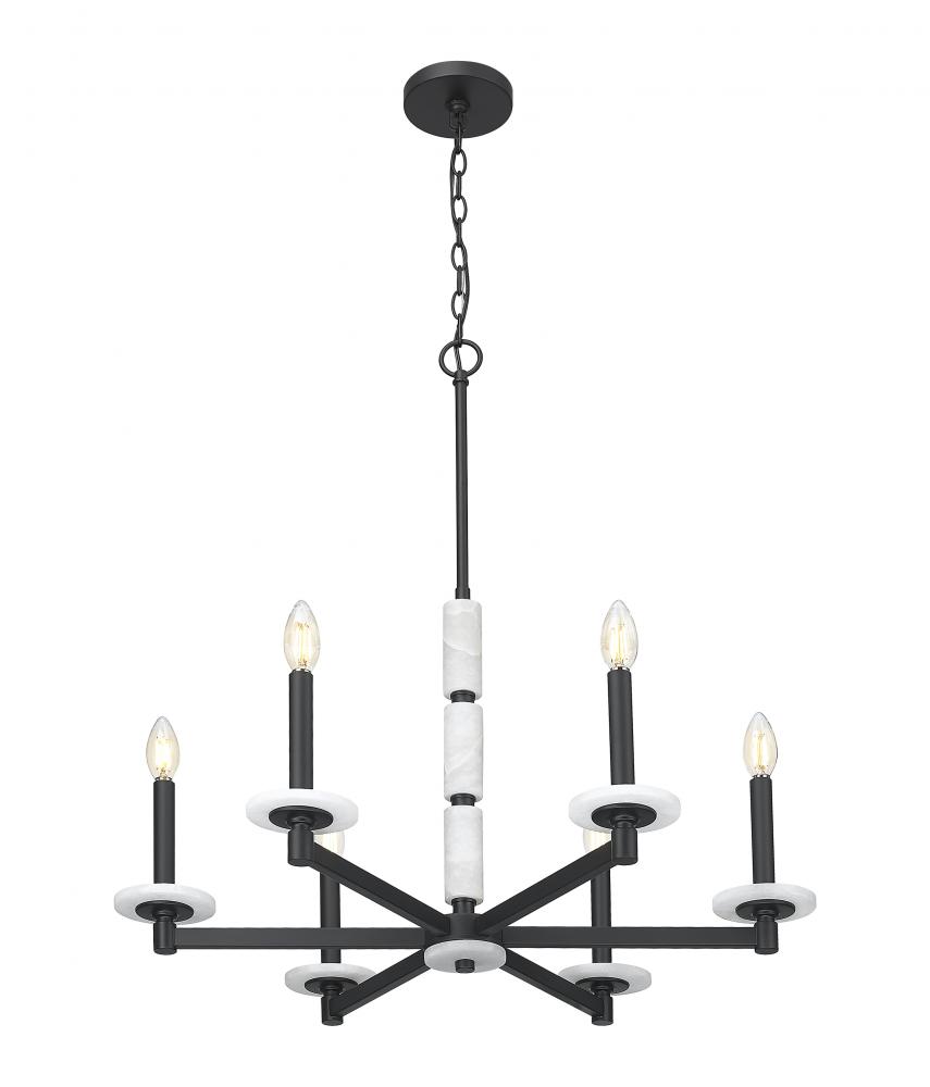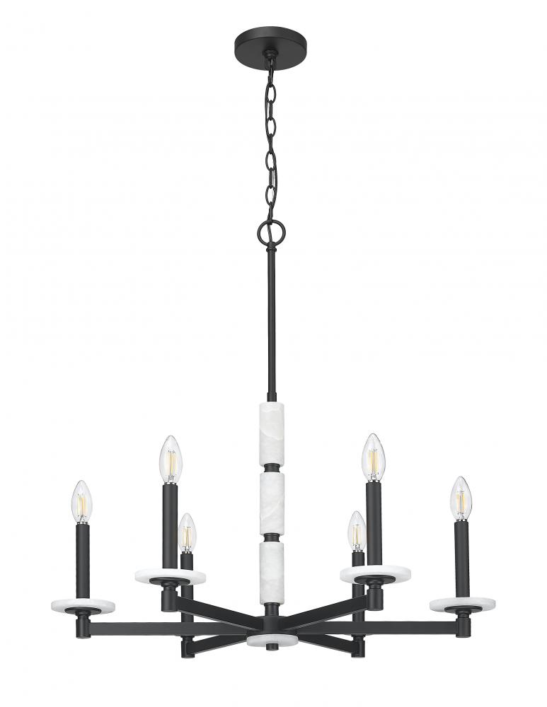 A quiet force of design, this chandelier speaks in balance and boldness. Six alabaster spheres radiate soft, sculptural light from a matte black frame that grounds the piece with modern contrast. The result is a chandelier that feels both striking and serene, perfect for anchoring dining rooms, foyers, or statement-making spaces.
