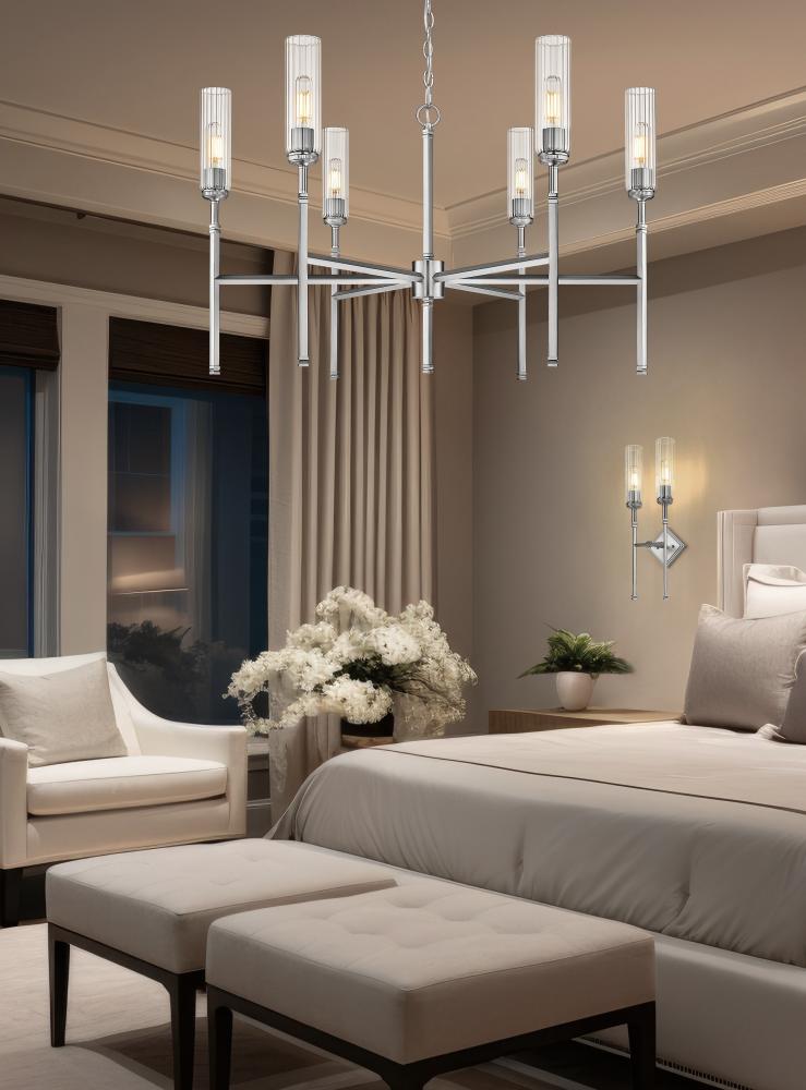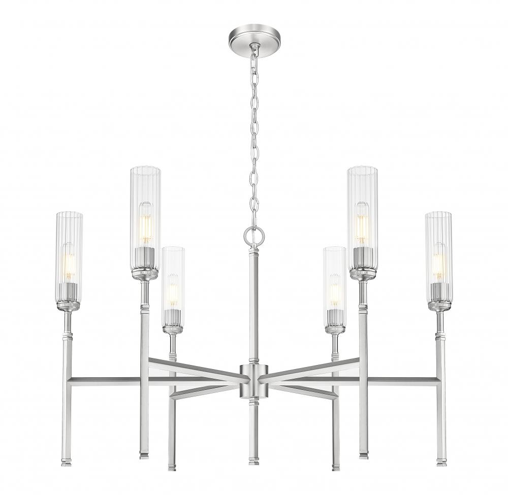 The soft gleam of on a brushed nickel finish highlights the clean, sleek style of this modern six-light chandelier. It pairs fluted clear glass shades with slim stems, creating a champagne flute effect that brings robust character and sophistication over a living or dining room. The staggered lights create a compact but highly efficient silhouette, casting bright illumination without overwhelming your space.