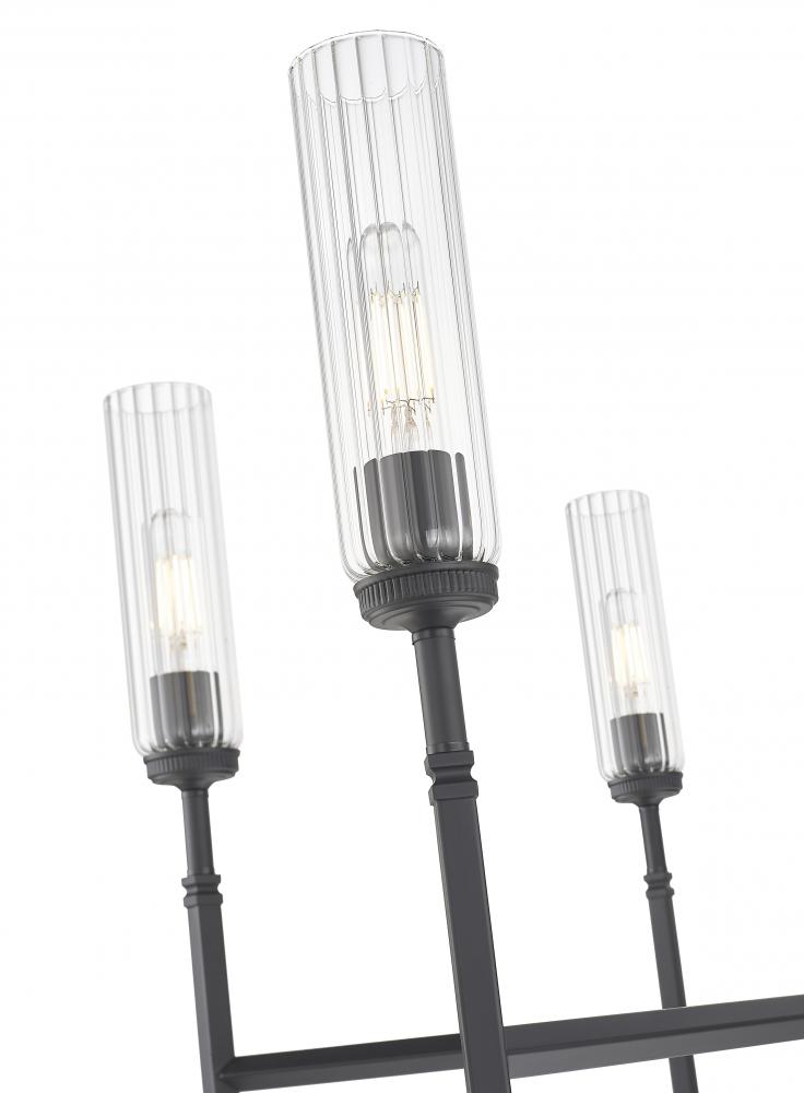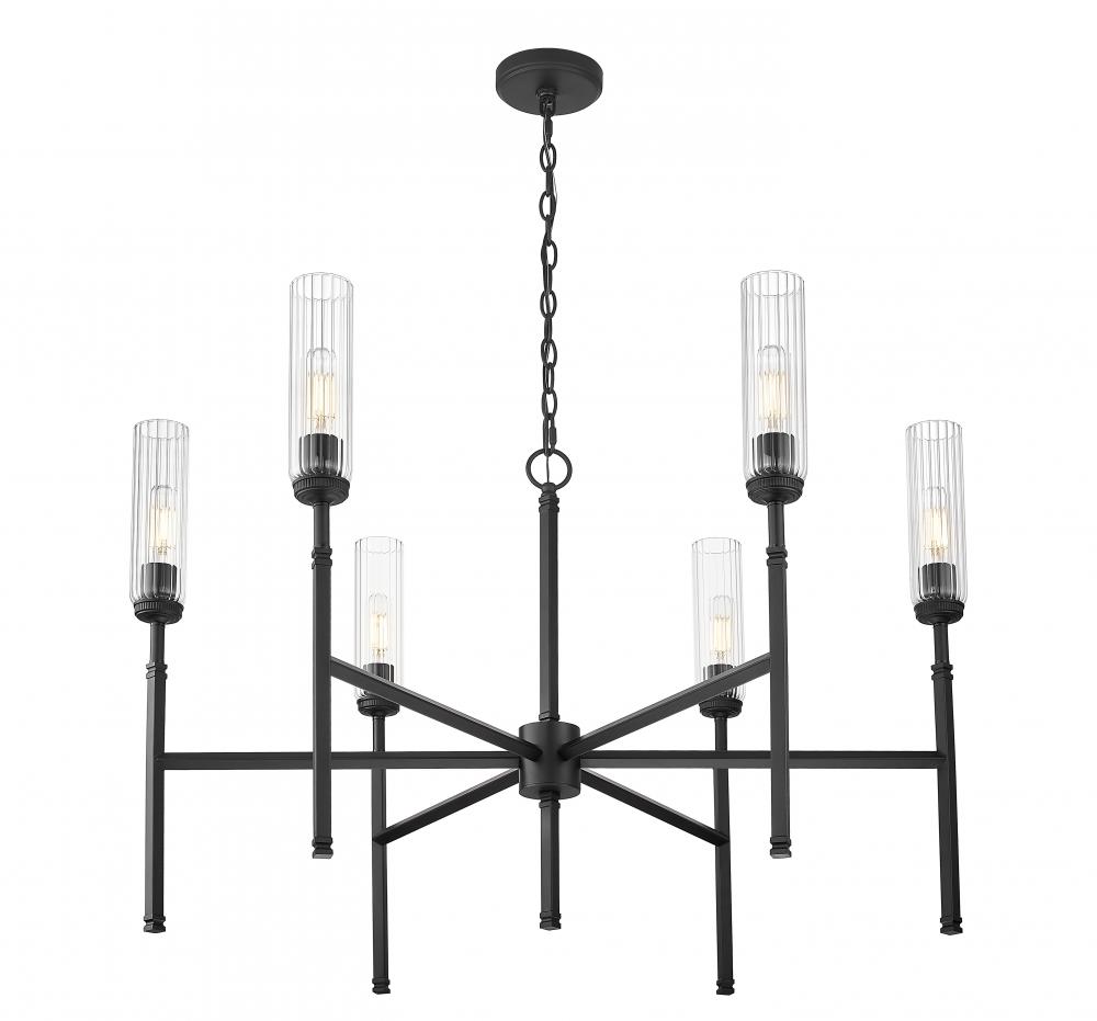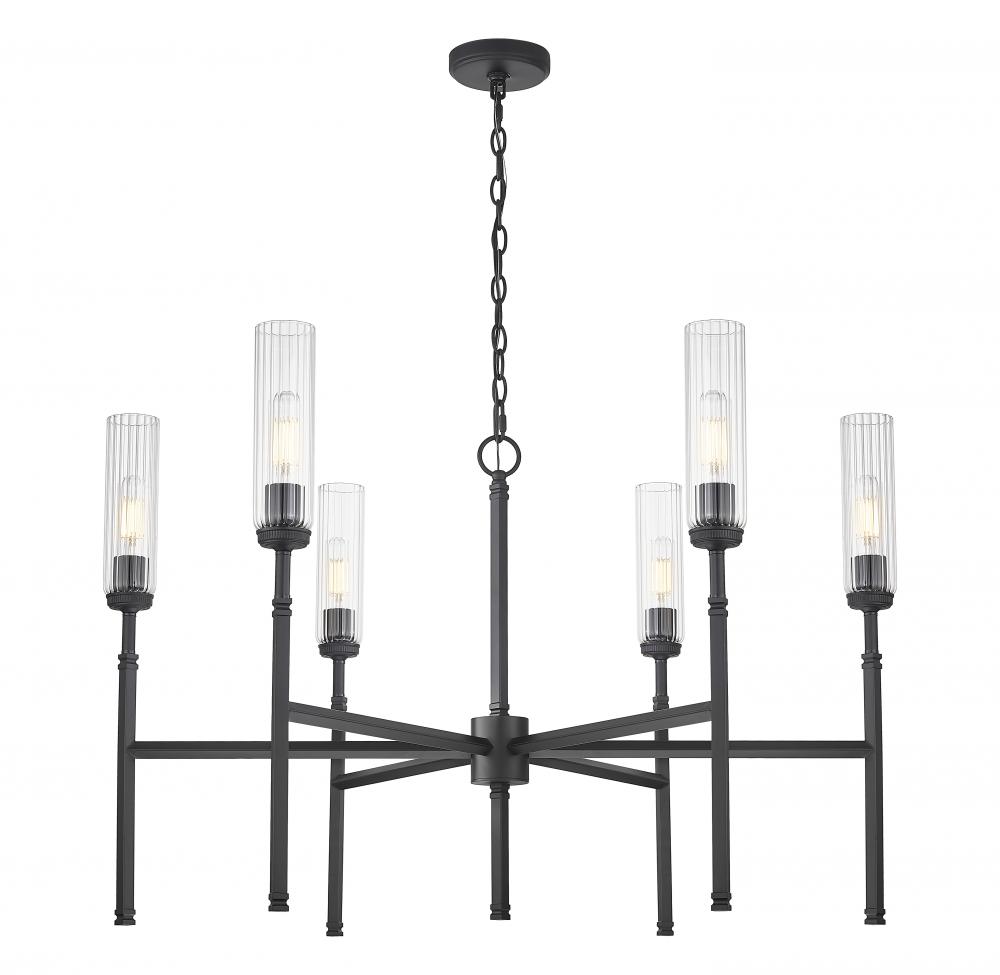 Embrace timeless design with the clean, slim lines and defining matte black finish that decorate this modern six-light chandelier. Each light features a slim stem and tall fluted clear glass shade, evoking a classic champagne flute. The clustered arrangement staggers the light to maintain a compact profile thats just right for living and dining rooms, alike.