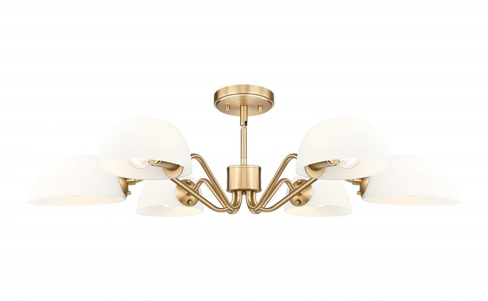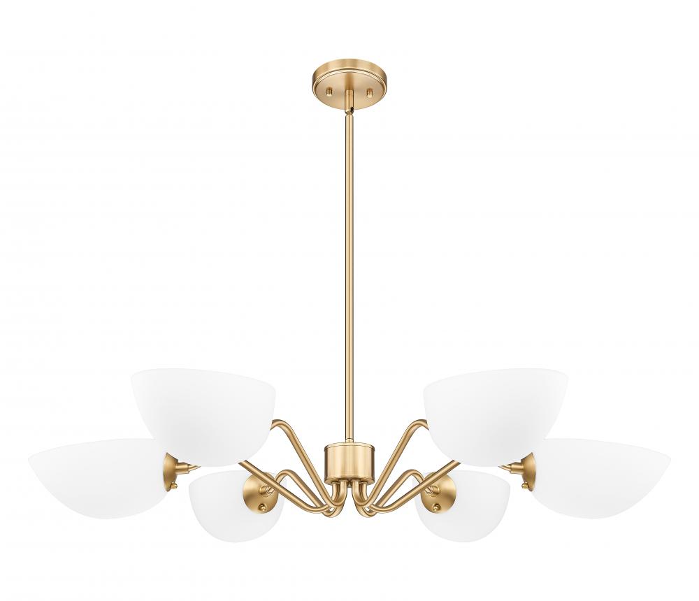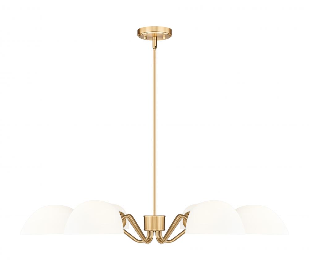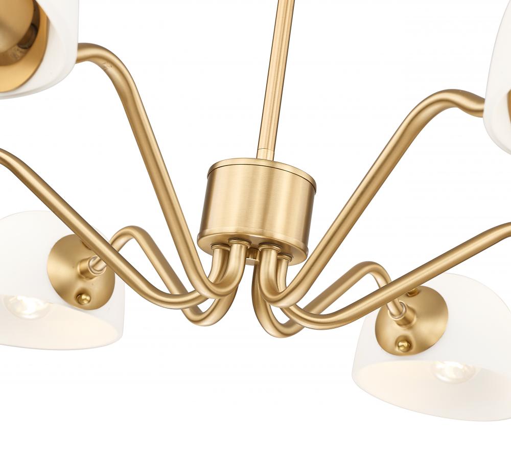 Playful personality shows itself in the curvy arms featured on this modern six-light chandelier. Its a radiant, flexible fixture that casts up or down lighting based on the positioning of its domed opal glass shades. In modern gold, it radiates warmth, elegance and lovely illumination all in the same moment.