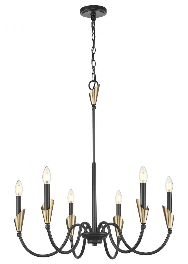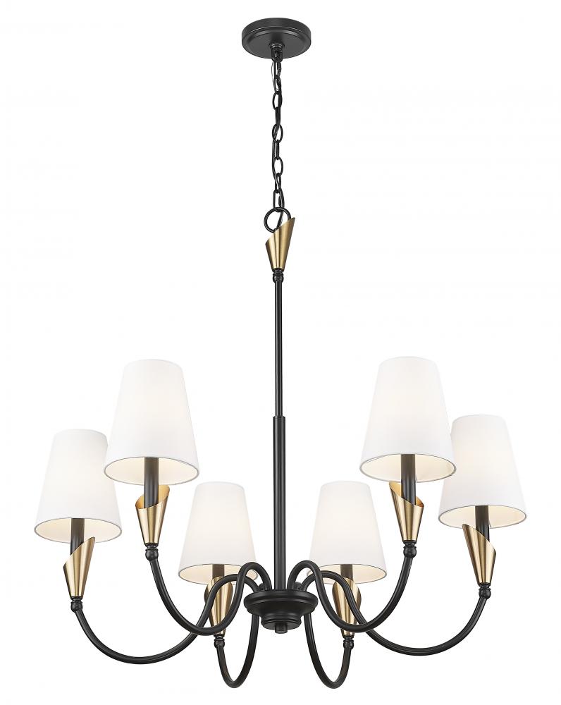 This chandelier draws the eye with its sweeping lines and luminous finishes, offering a modern update to timeless form. The matte black structure is lifted by gold accents, while six white shades diffuse the light in soft, even layers. It?s statement lighting that still feels delicate.