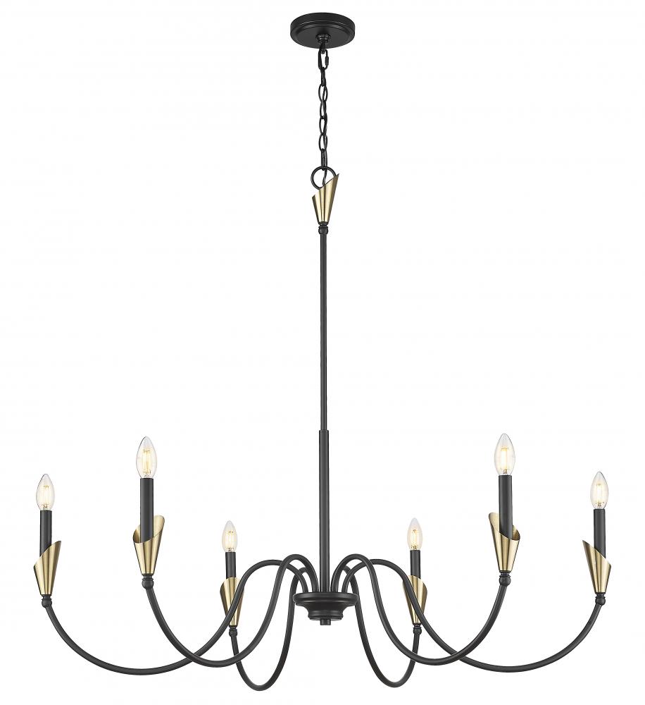 Chic and structured with a sense of movement, this chandelier balances contrast and curve with effortless style. Matte black arms stretch upward in fluid arcs, accented with gold touches and softened by white linen shades. It?s a modern classic that suits spaces from bold to neutral.