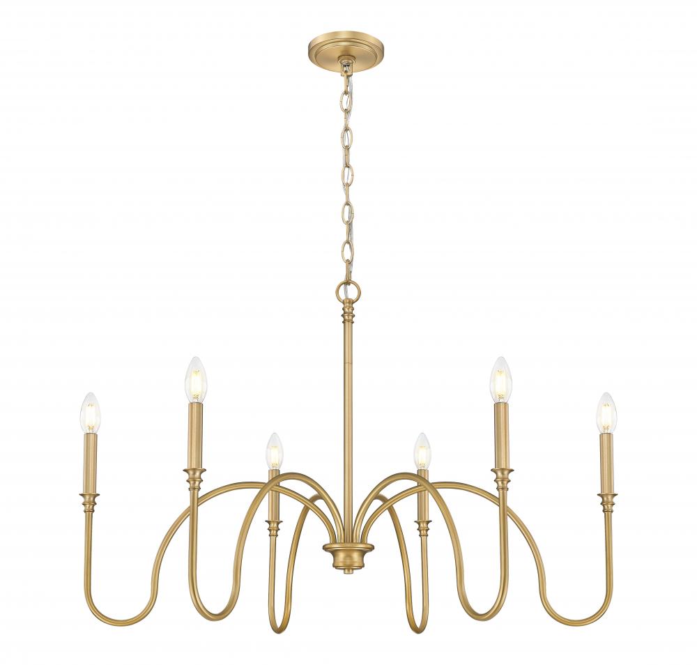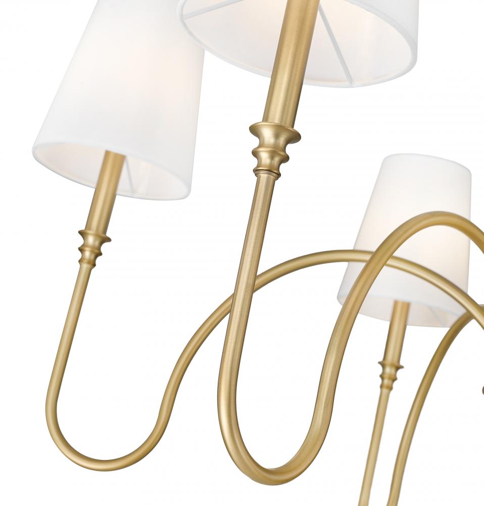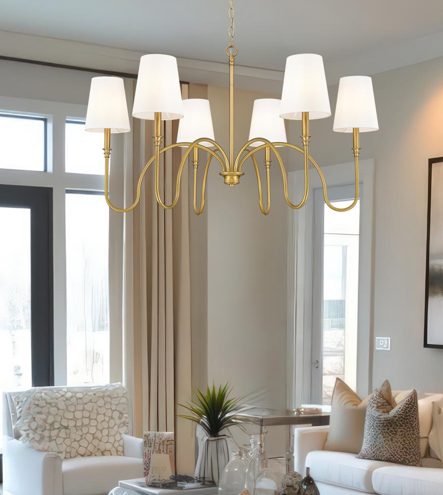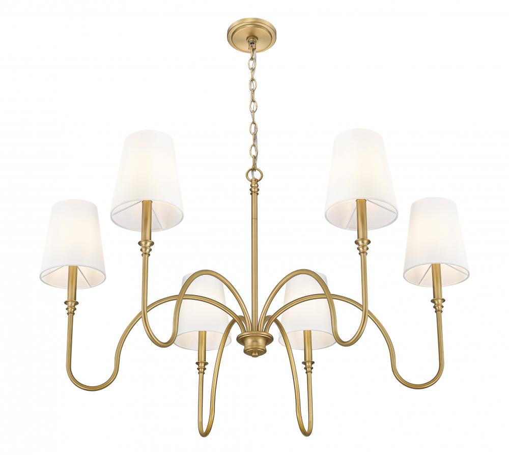 The open-air motif of this six-light chandelier delivers a blend of romance and timeless elegance, perfect for a robust light source over dining ensembles, in entryways, and in large living rooms. Rubbed brass finish steel creates a warm impact that heightens when this chandelier is lit. Tapered linen shades bring a timeless look to a fixture youll love.