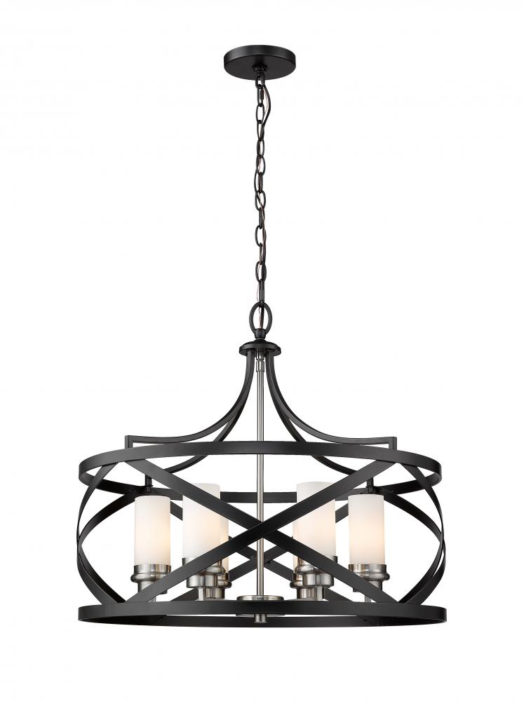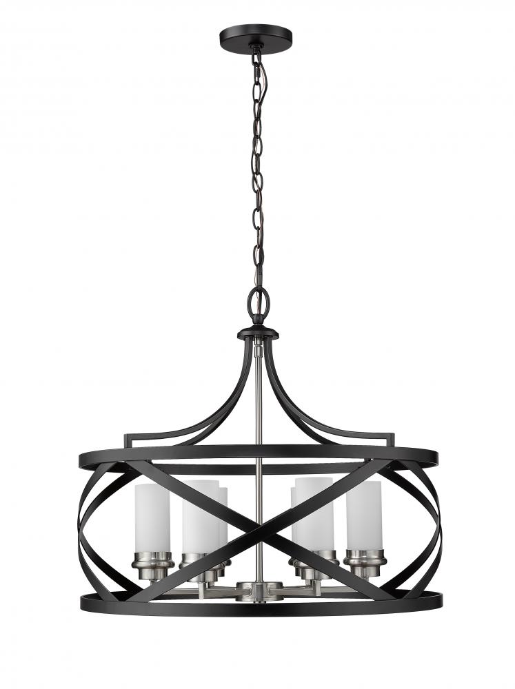 Dynamic elegance is the hallmark of this two-tone six-light pendant. Its crafted with a matte black and brushed nickel finish with the lights housed inside a round design highlighted by X-cross patterns. This light brings a dynamic element to any foyer, grand dining room, living room, or kitchen.