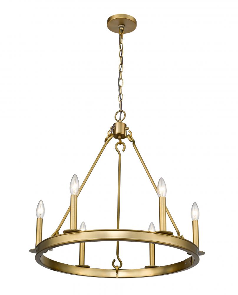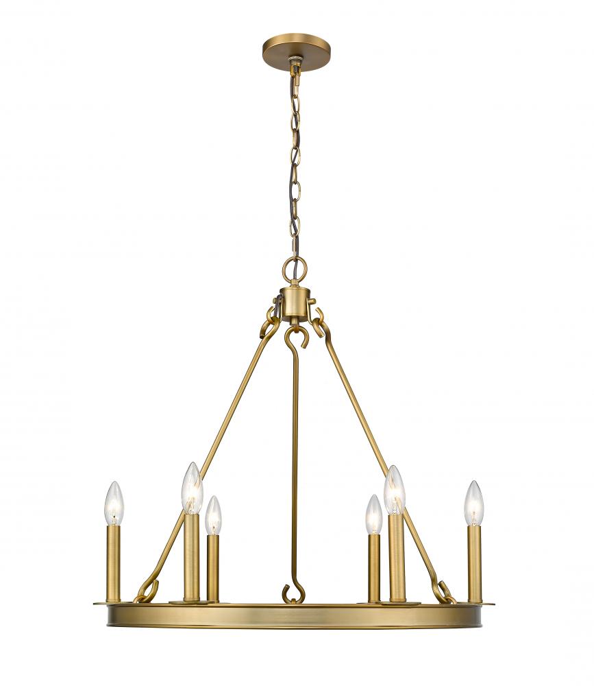 Youll love the alluring style of this six-light chandelier for your home. Its crafted in a lustrous olde brass finish and features the candle-inspired lights in a charming round design. Its perfectly suited for the breakfast nook, foyer, kitchen, or entertainment room.