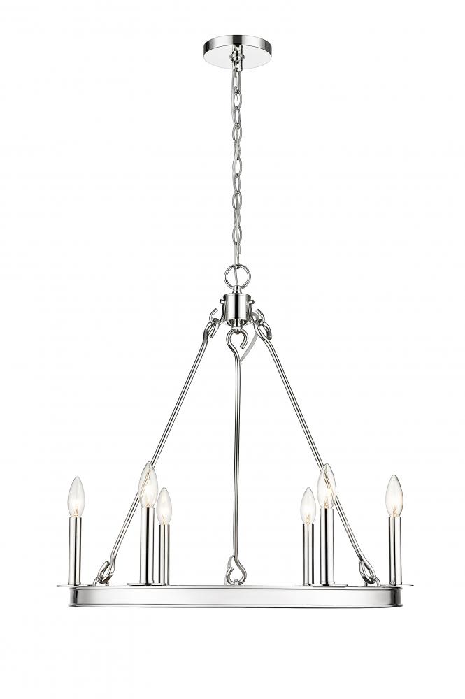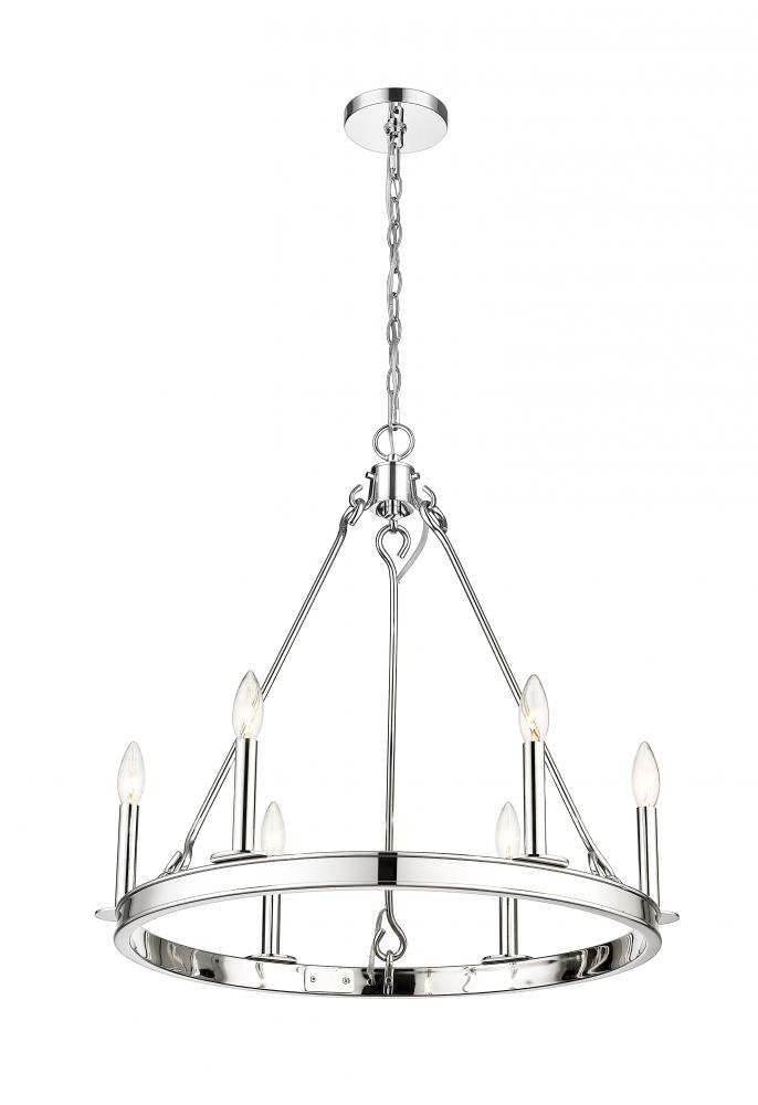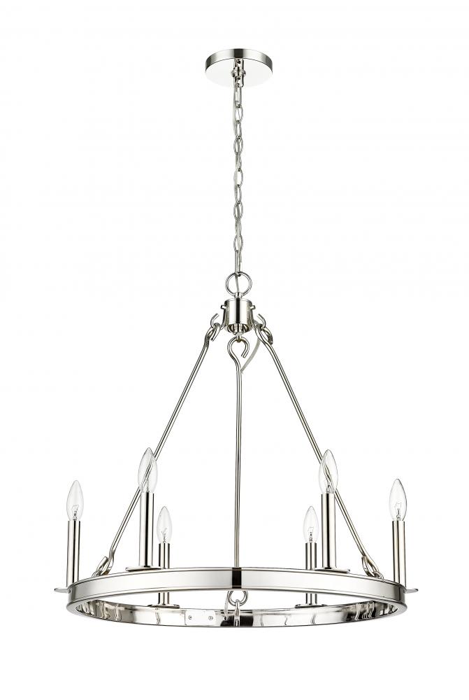 Choose a decadent six-light chandelier from the Barclay collection and add a theatrical motif to a compact dining space or entryway. A classic ring silhouette features construction of polished nickel finish steel, adding versatility to its long list of attributes. Classic round silhouetting suggests a palace theme that speaks to sparkling expressive style in this chandelier offering charming, romantic candelabra bulb mounts.