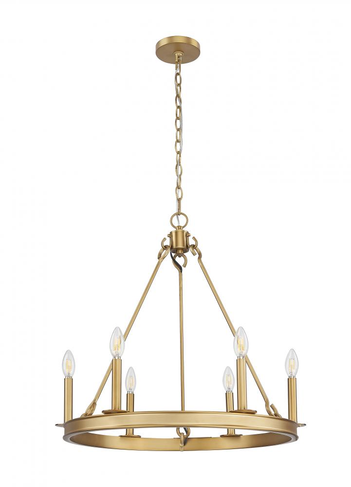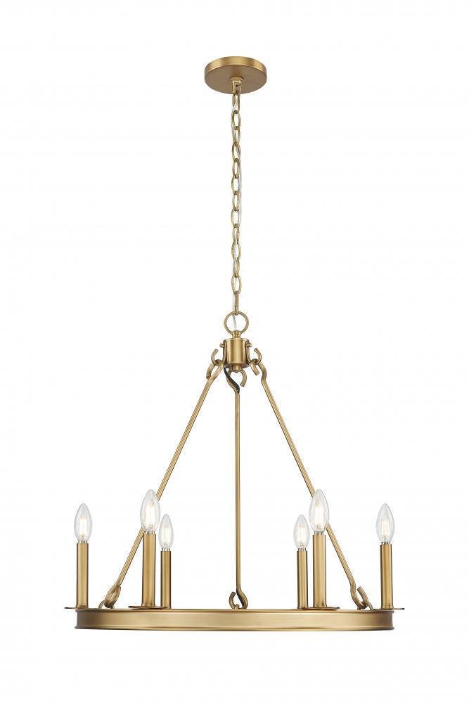 Modern minimalism blends with vintage character in this six-light ring chandelier. Perfect for a dining table or cozy sitting area, it features a sleek ring silhouette with candelabra lights for inviting illumination. A rubbed brass finish delivers impeccable warmth and richness, perfect for a welcoming home.
