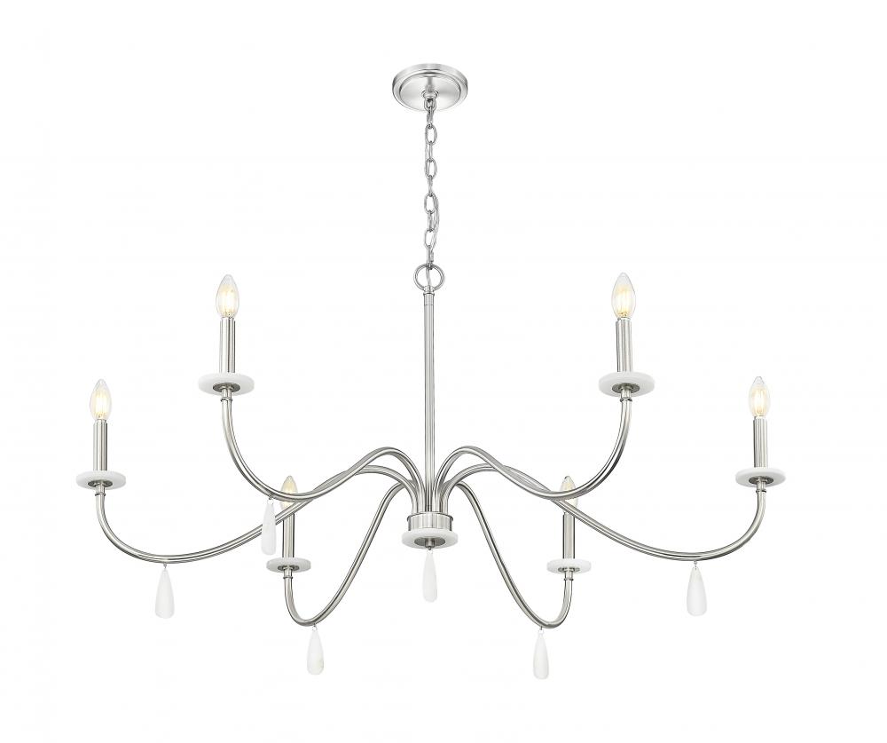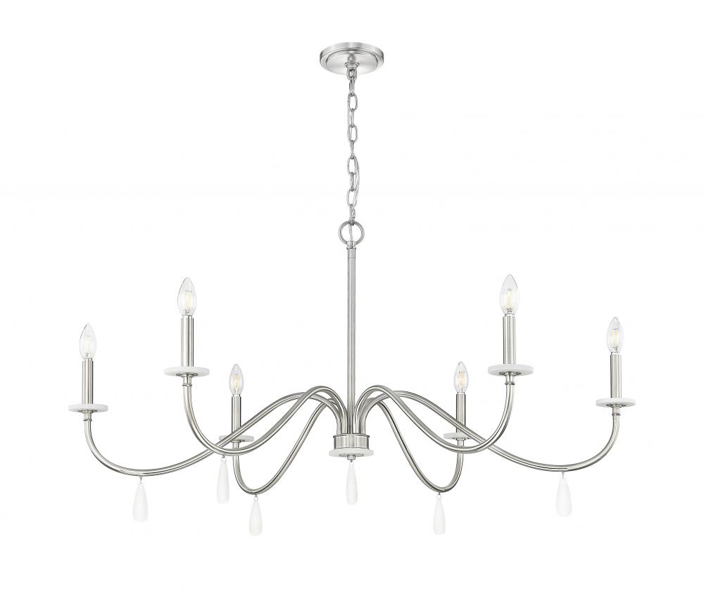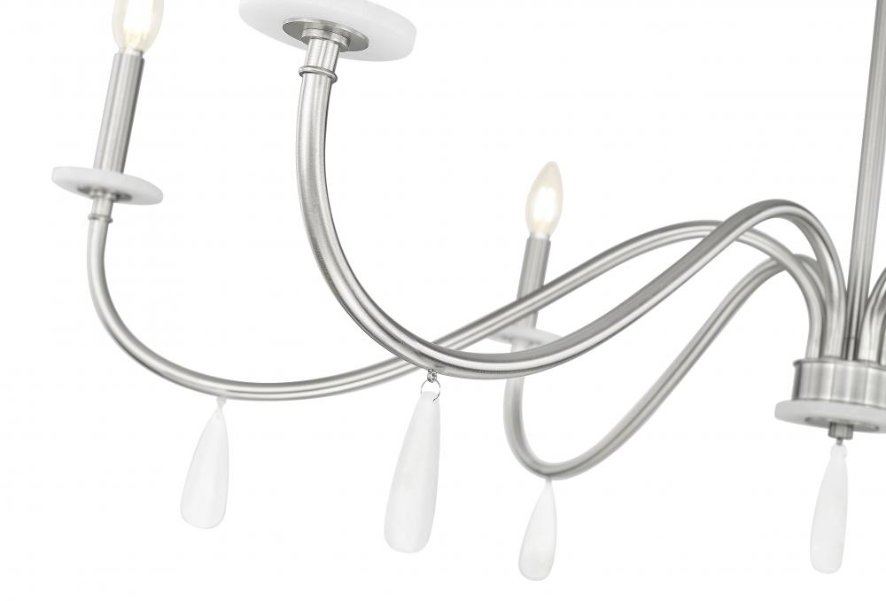 The presence of decorative drop elements brings a romantic feel to this six-light chandelier, an excellent choice for illuminating dining spaces, living rooms, and foyers. Classic, timeless style is versatile with brushed nickel finish steel framing and cable suspension, as ornate boboches under torch sleeves make room for your choice of separately purchased bulbs. Alluringly curved arms form an eye-pleasing silhouette making a statement in any space, as dimmable features allow for varying light levels.