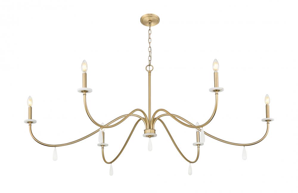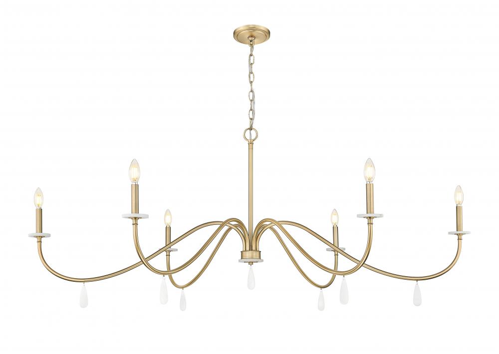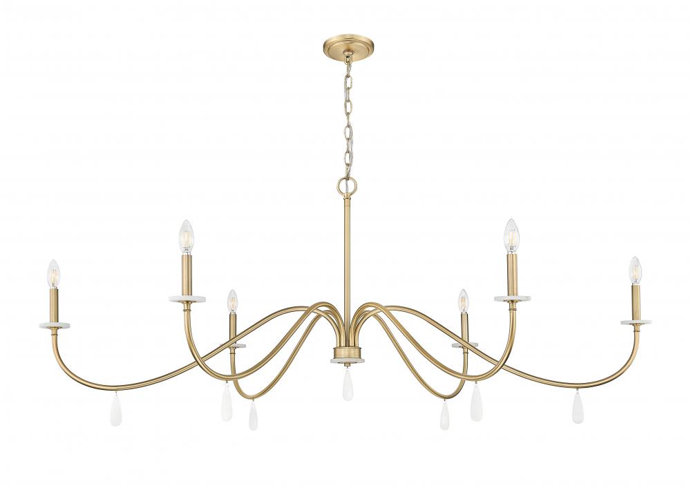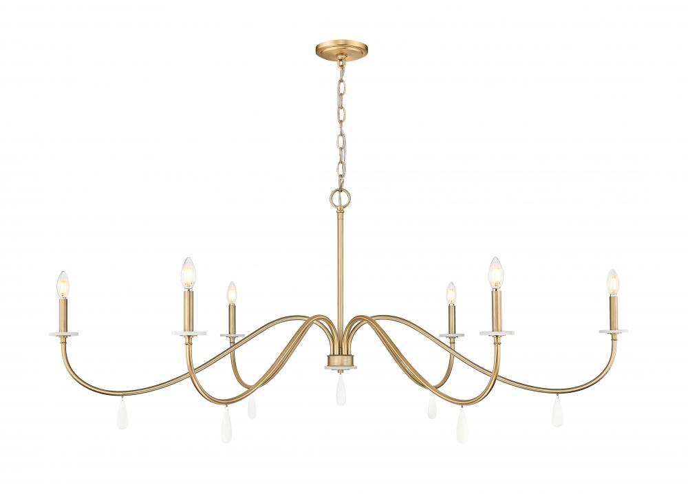 Affix your eyes on gracefully curved arms that make a statement in this six-light chandelier, an exceptional choice for blending sophistication and elegance. Dining rooms, living rooms, and foyers take on a new life when illuminated with this modern gold finish steel fixture with smooth torch-style holders atop alabaster bobeches, and dangling artisan elements showing off below. Dimmable features make mood lighting an essential part of this beautiful light fixture.
