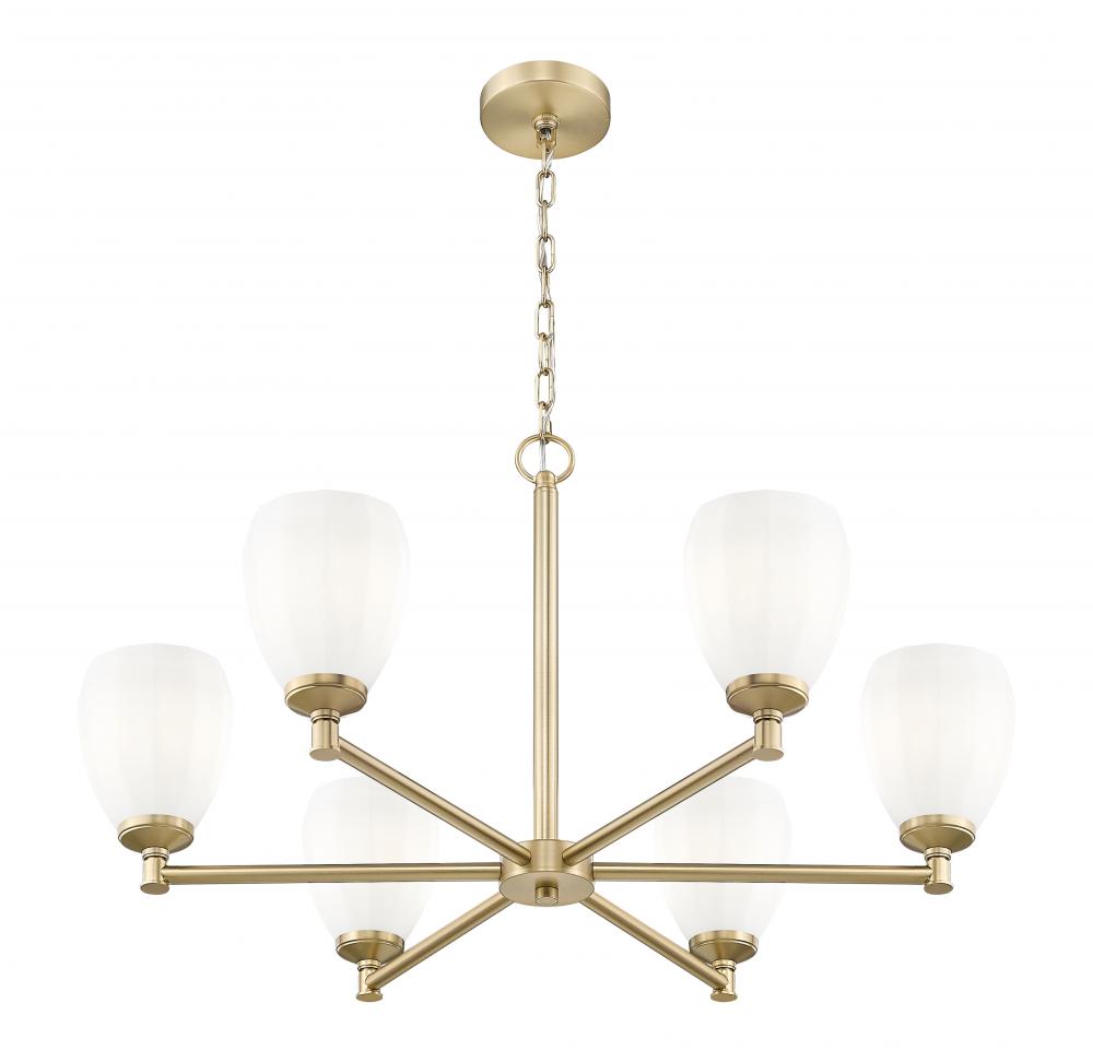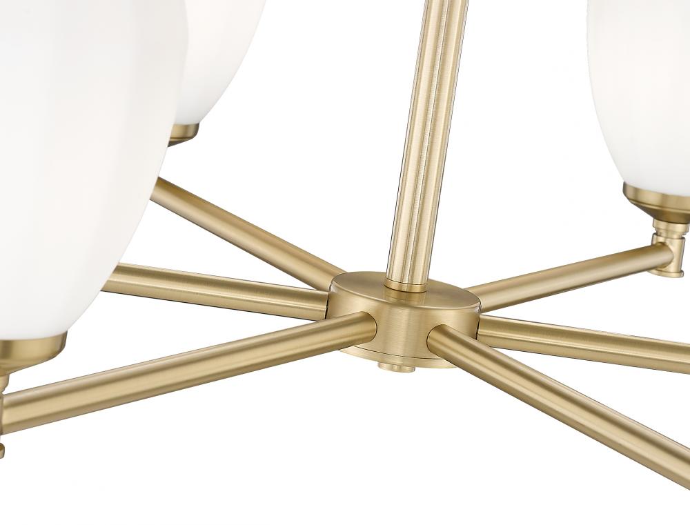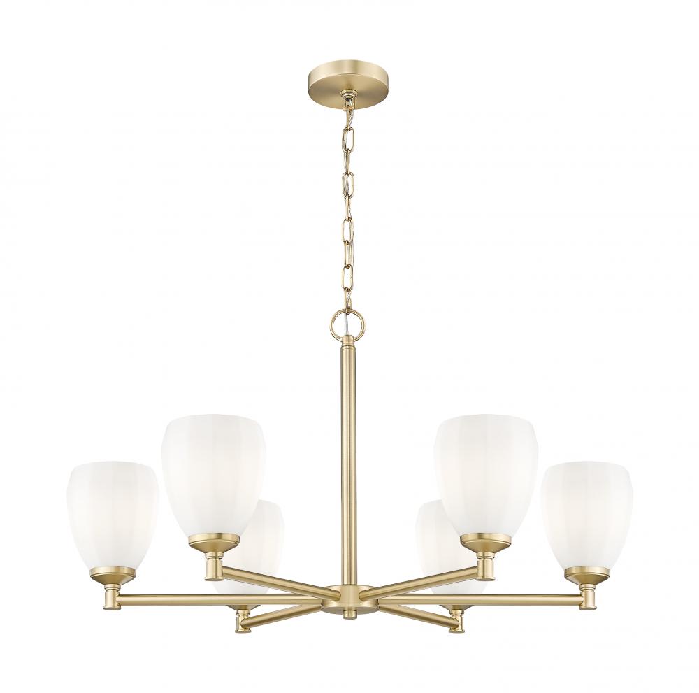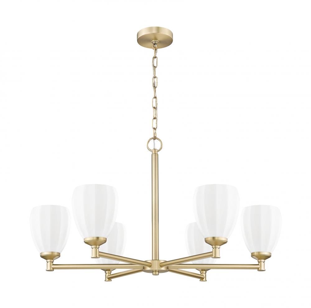 Instill classical elegance with the modern minimalism and rich warmth of this six-light chandelier. It showcases a modern gold finish thats warm and inviting, with matte opal glass shades that ensure soft, inviting illumination. The perfect complement to a family dining room or inviting foyer.