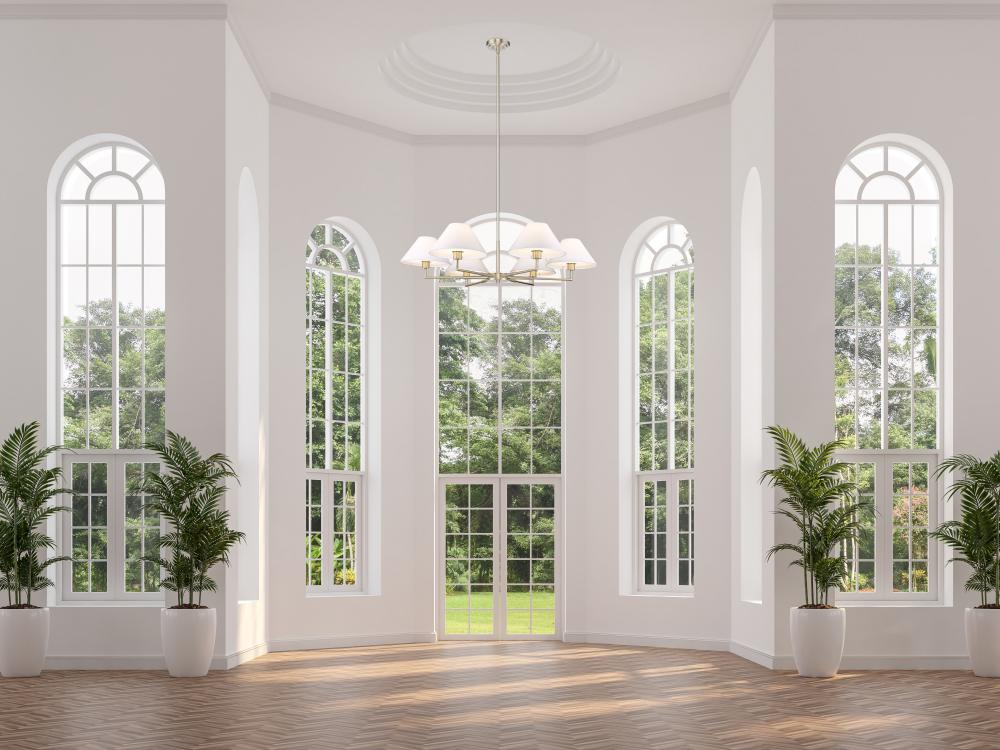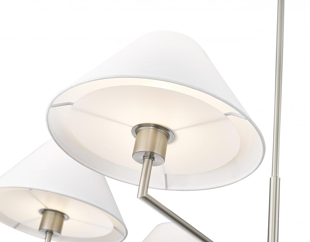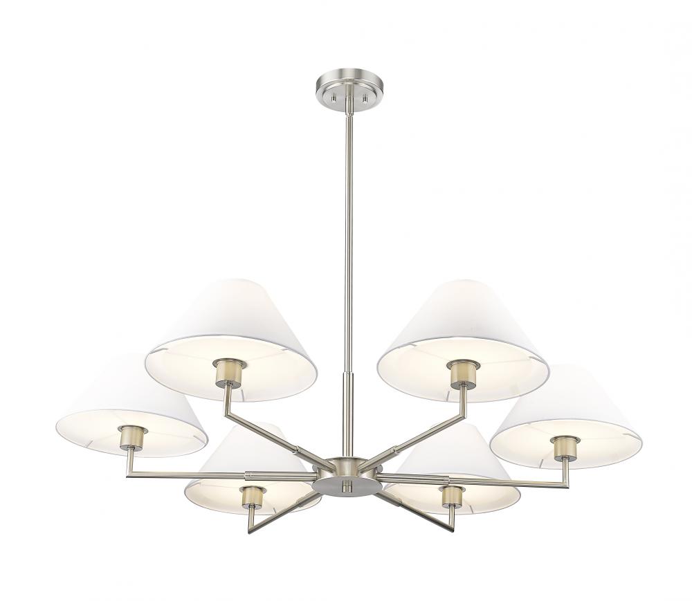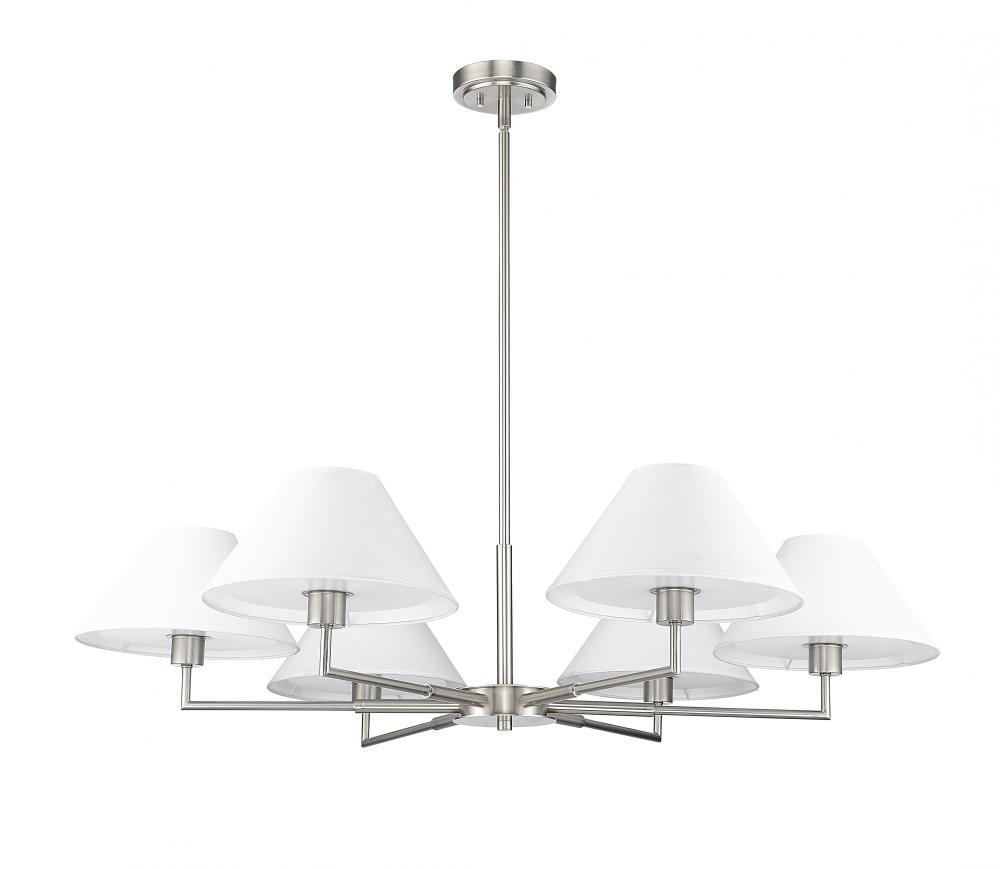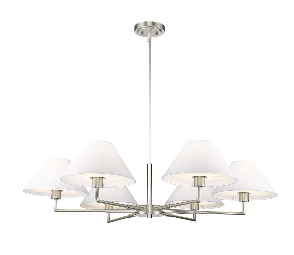 Inject a little modern simplicity into surrounding decor with a stylish six-light chandelier. In a gleaming brushed nickel finish, this delightful fixture is a flexible option everywhere from your dining room to a master suite, casting warm, bright illumination while instilling radiant elegance. Its six lights are complete with empire shades for a classic touch updated with white linen for light, bright ambiance.