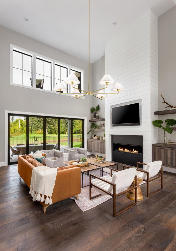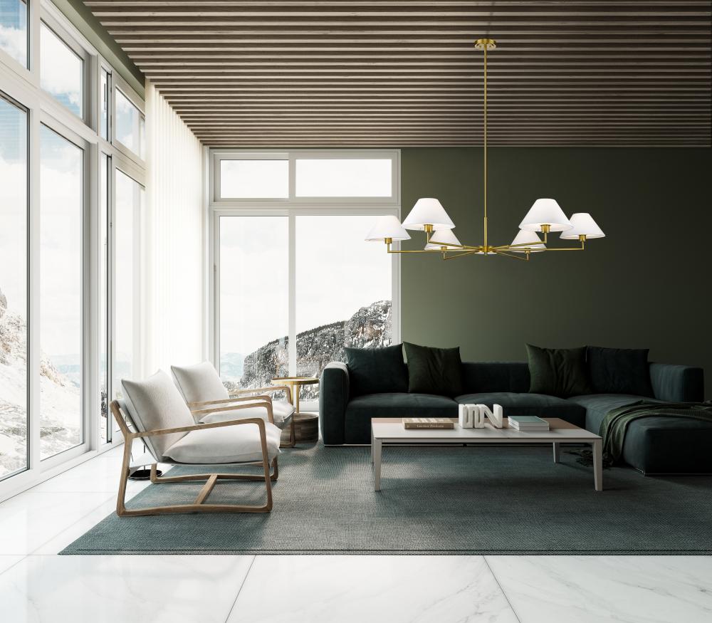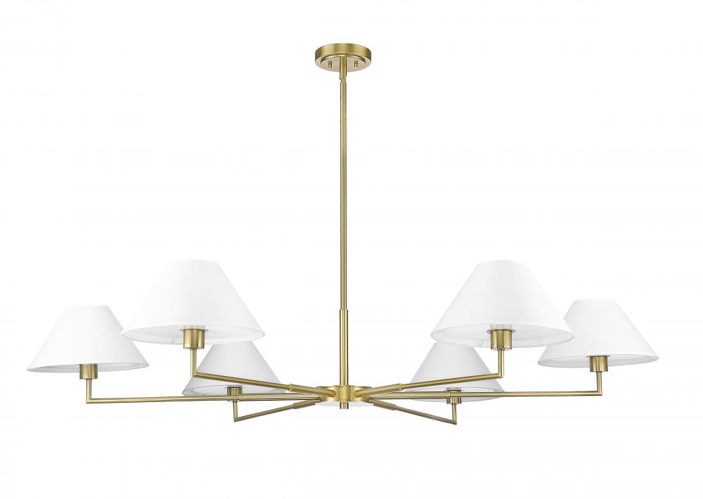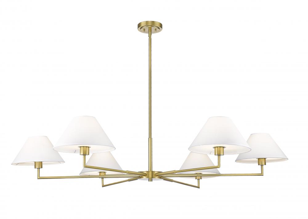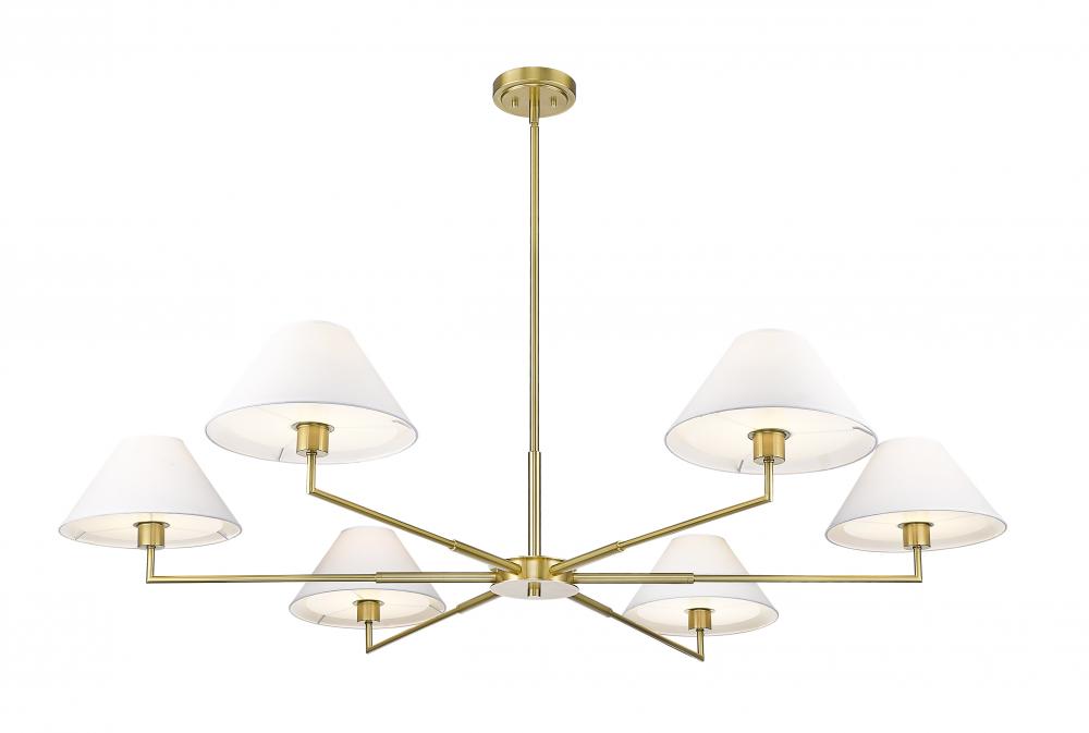 Surrounding decor is instantly elevated with the sleek simplicity of a stylishly modern, wide six-light chandelier. In a gleaming luxe gold finish, this delightful fixture is a flexible option everywhere from your dining room to a master suite, casting warm, bright illumination while instilling radiant elegance. Its six lights are complete with empire shades for a classic touch updated with white linen for light, bright ambiance.
