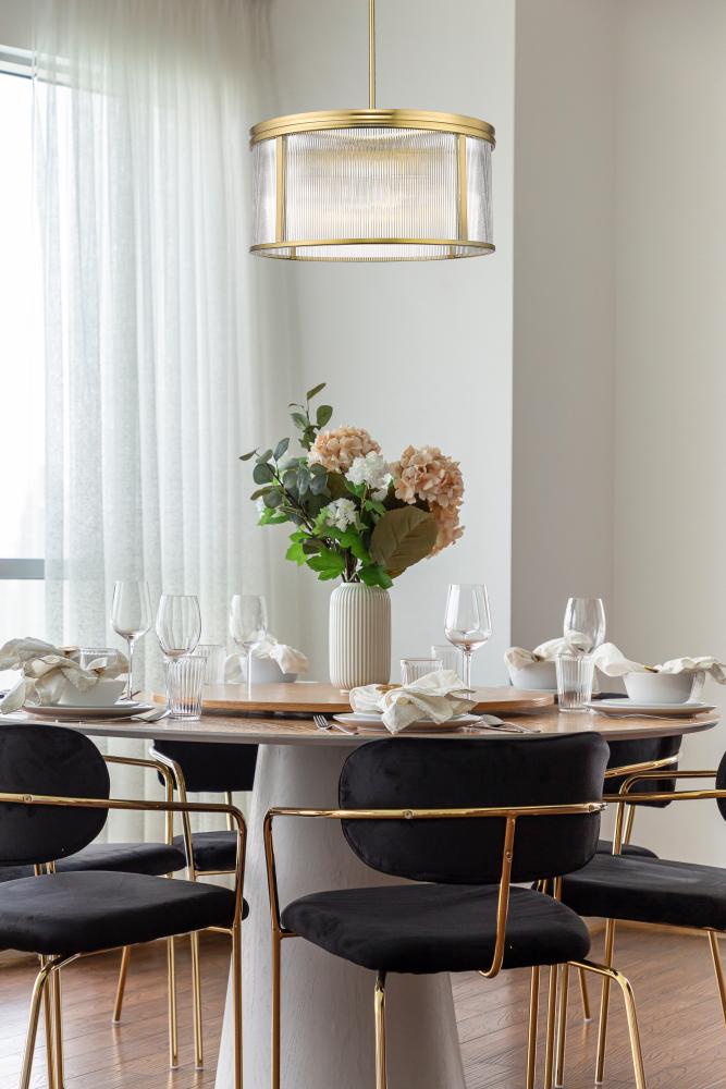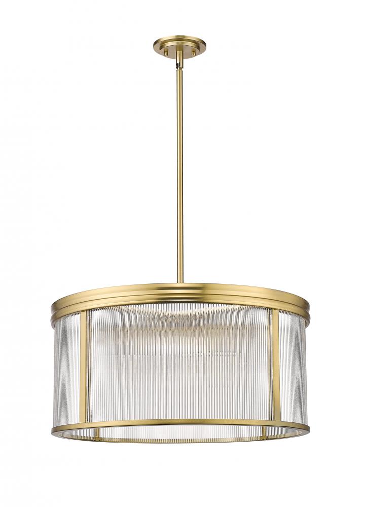 Capture the essence of modern simplicity in the elegant textural effect of architectural ribbed glass surrounding a chic six-light chandelier. Its drum silhouette is classic, complementing in virtually any space, while a glam modern gold finish is distinctive and warm against the walls in your favorite space.